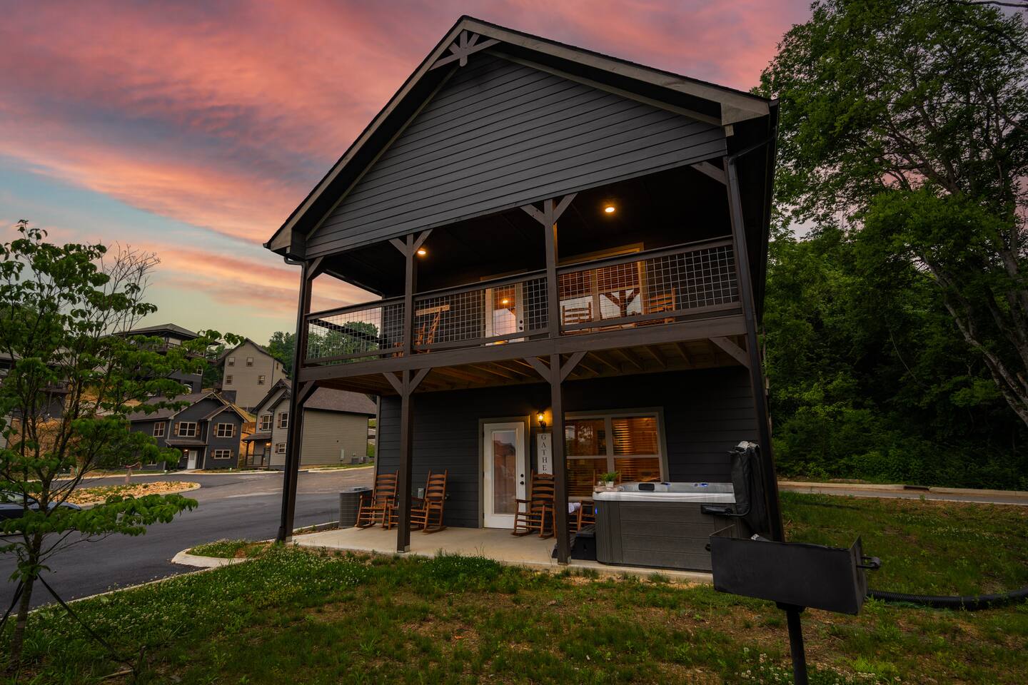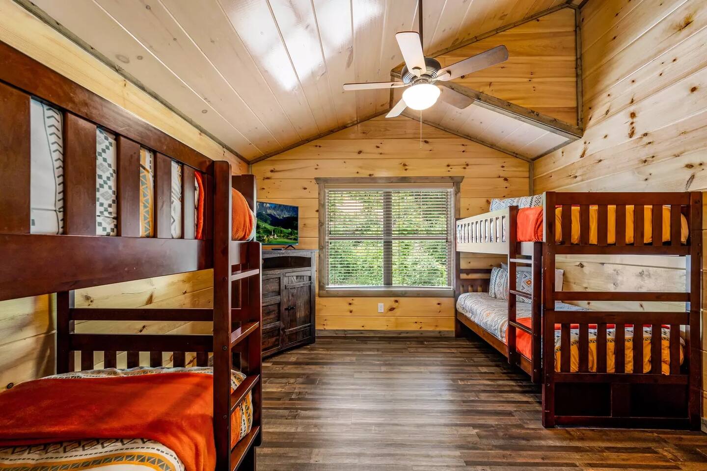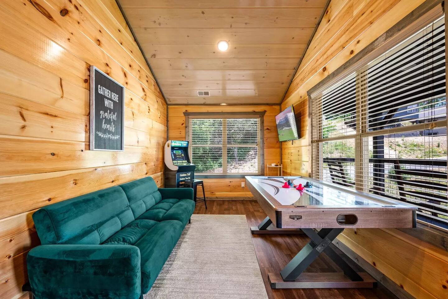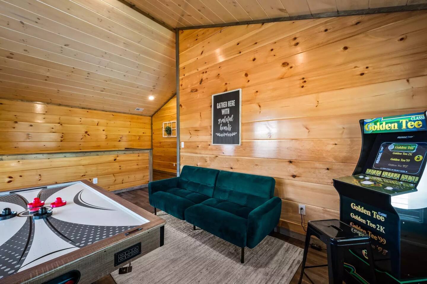 ✨ Cabin Highlights ✨ 🚗 Easy arrival: Paved, level roads, step-free entry, flat parking for up to 4 cars. ♨️ Covered hot tub with direct access from the king suite 🌄 Gentle distant mountain views from 3 covered decks. 🔥 Cozy great room with electric fireplace & big-screen TV. 🍳 Fully stocked stainless kitchen + bench/chair dining. 🐾 Dog-Friendly (max 2 pups) 🛌 Sleep & refresh (3BR • 2.5BA • sleeps 9) ✦Main level King with ensuite bathroom — Enjoy a comfy king-sized bed, Smart TV and private access out to the hot-tub. ✦Main level half bath– for added convenience. ✦Upstairs Queen bedroom —Comfy plush mattress w/ Smart TV ✦Upstairs Bunk room— Spacious room with vaulted ceilings featuring two twin bunk beds + Smart TV ✦Loft futon for an extra guest. ✦Upstairs Bathroom— Full bathroom with large double vanity 🎮 Play & gather Game loft: Golden Tee arcade, air hockey, seating area & TV. Smart TVs in every bedroom (log into your apps). Washer/Dryer on the main level. 🌤️ Outdoors Three covered decks for all-weather lounging with rocking chairs Park-style grill off the patio. (Charcoal Needed) 📍 Close to everything Dollywood 4.2 mi The Island at Pigeon Forge 5.9 mi Soaky Mountain & Wilderness Resort ~4.1 mi Ober Gatlinburg 16.7 mi