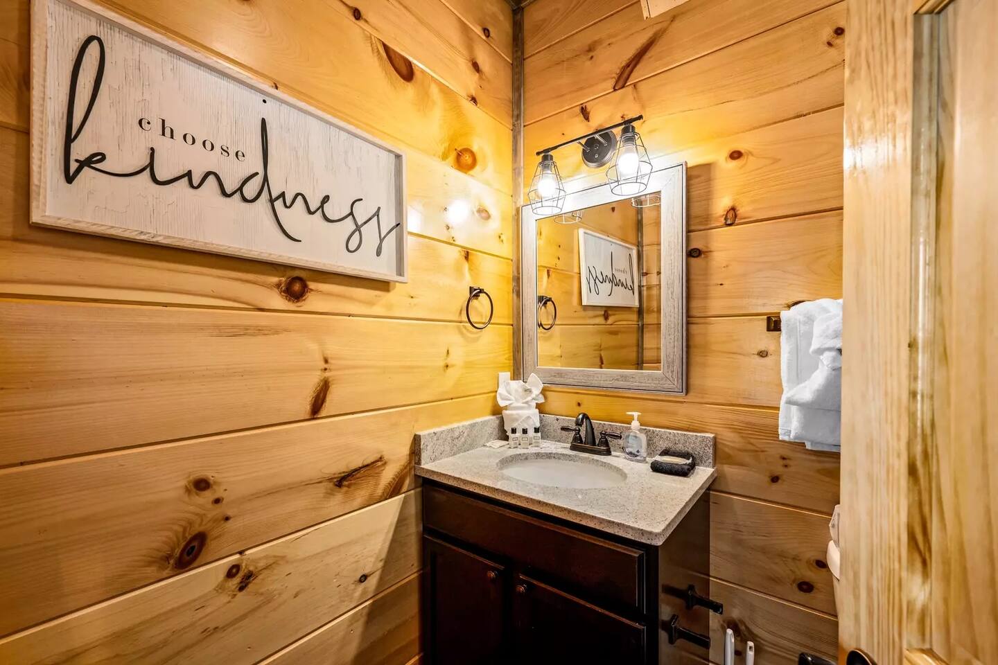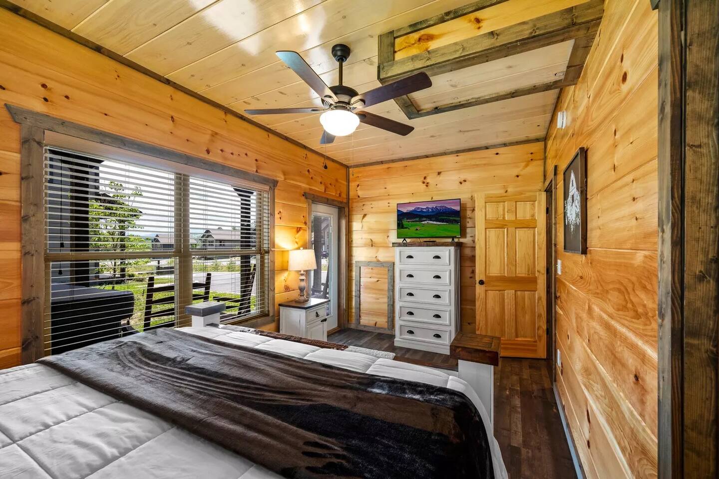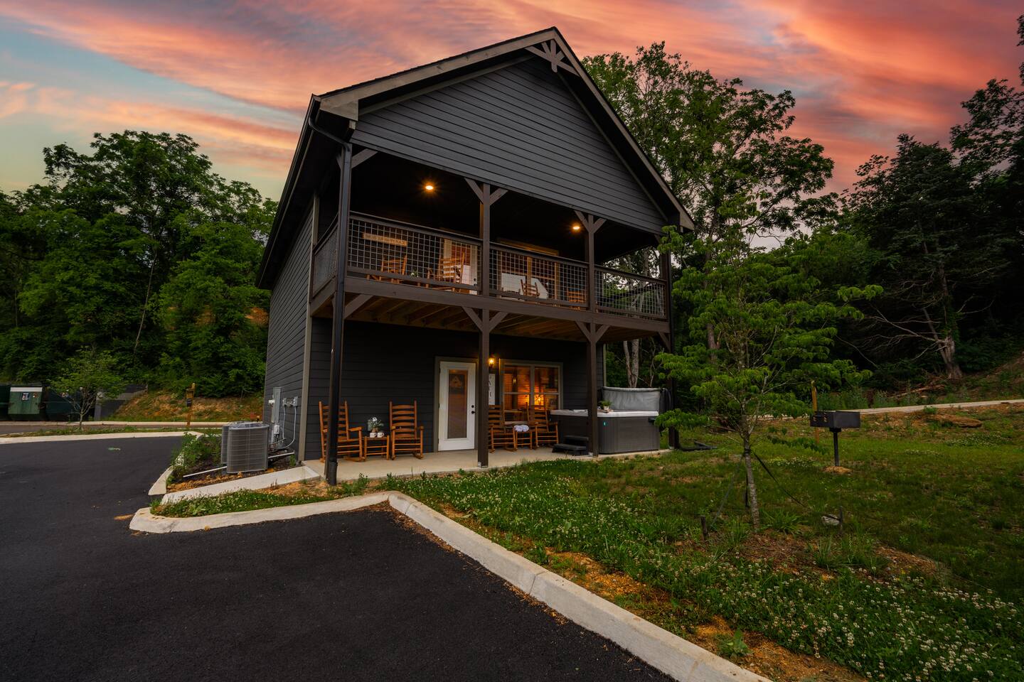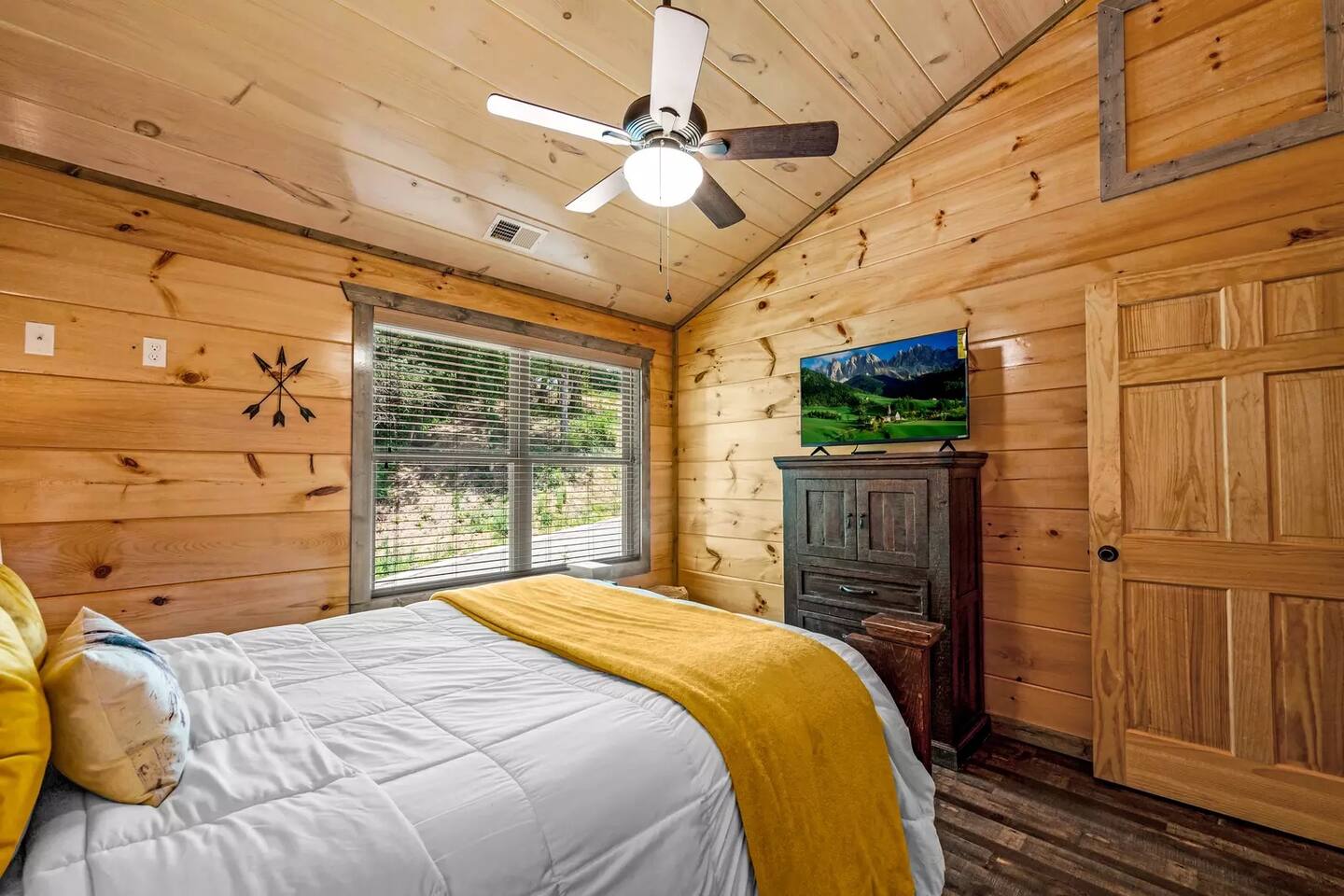 ✨ Cabin Highlights ✨ 🚗 Easy arrival: Paved, level roads, step-free entry, flat parking for up to 4 cars. ♨️ Covered hot tub with direct access from the king suite 🌄 Gentle distant mountain views from 3 covered decks. 🔥 Cozy great room with electric fireplace & big-screen TV. 🍳 Fully stocked stainless kitchen + bench/chair dining. 🐾 Dog-Friendly (max 2 pups) 🛌 Sleep & refresh (3BR • 2.5BA • sleeps 9) ✦Main level King with ensuite bathroom — Enjoy a comfy king-sized bed, Smart TV and private access out to the hot-tub. ✦Main level half bath– for added convenience. ✦Upstairs Queen bedroom —Comfy plush mattress w/ Smart TV ✦Upstairs Bunk room— Spacious room with vaulted ceilings featuring two twin bunk beds + Smart TV ✦Loft futon for an extra guest. ✦Upstairs Bathroom— Full bathroom with large double vanity 🎮 Play & gather Game loft: Golden Tee arcade, air hockey, seating area & TV. Smart TVs in every bedroom (log into your apps). Washer/Dryer on the main level. 🌤️ Outdoors Three covered decks for all-weather lounging with rocking chairs Park-style grill off the patio. (Charcoal Needed) 📍 Close to everything Dollywood 4.2 mi The Island at Pigeon Forge 5.9 mi Soaky Mountain & Wilderness Resort ~4.1 mi Ober Gatlinburg 16.7 mi