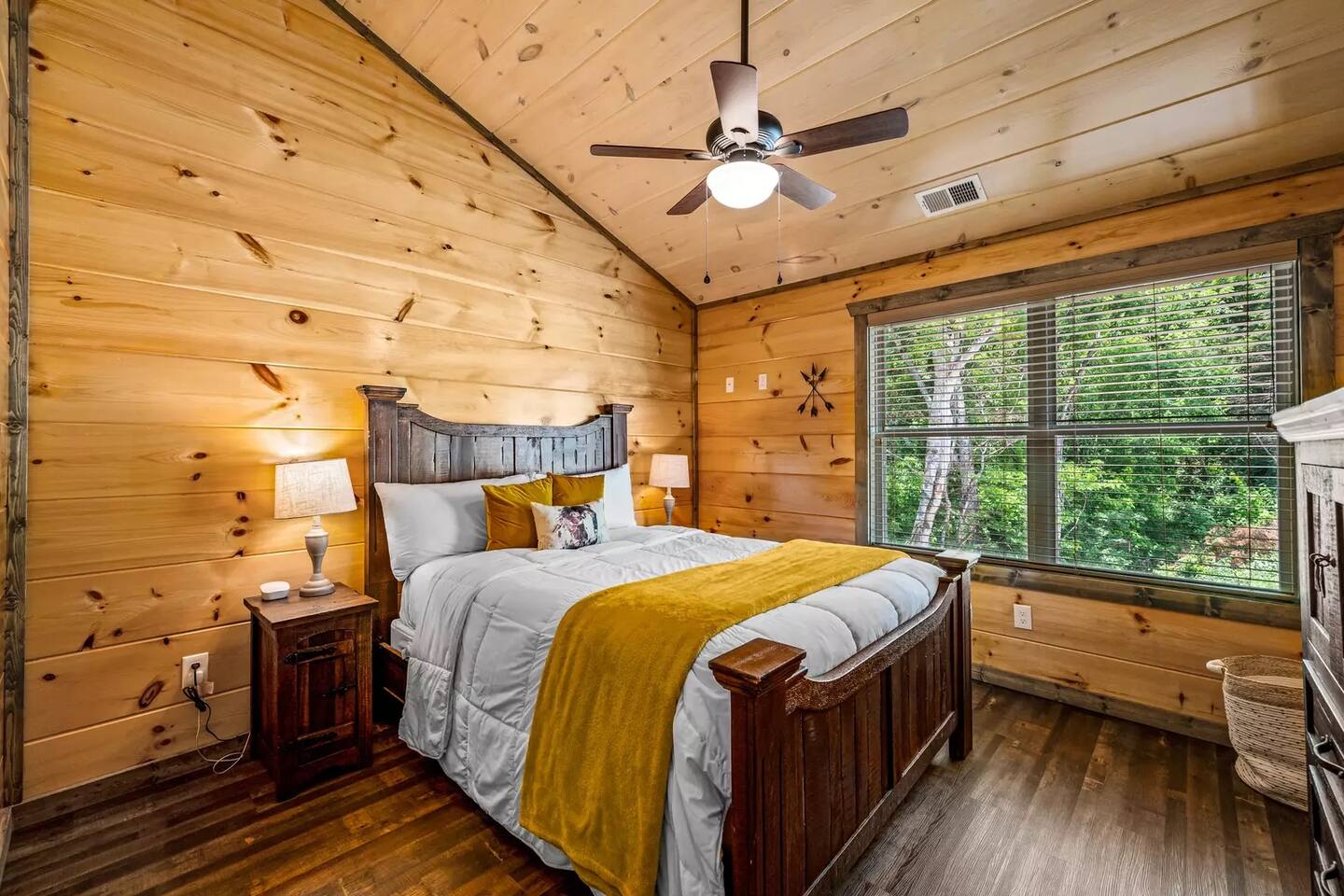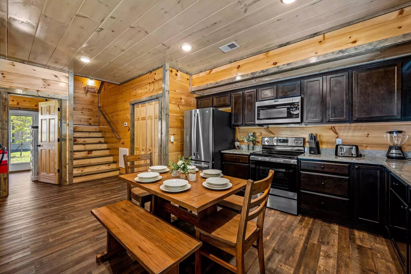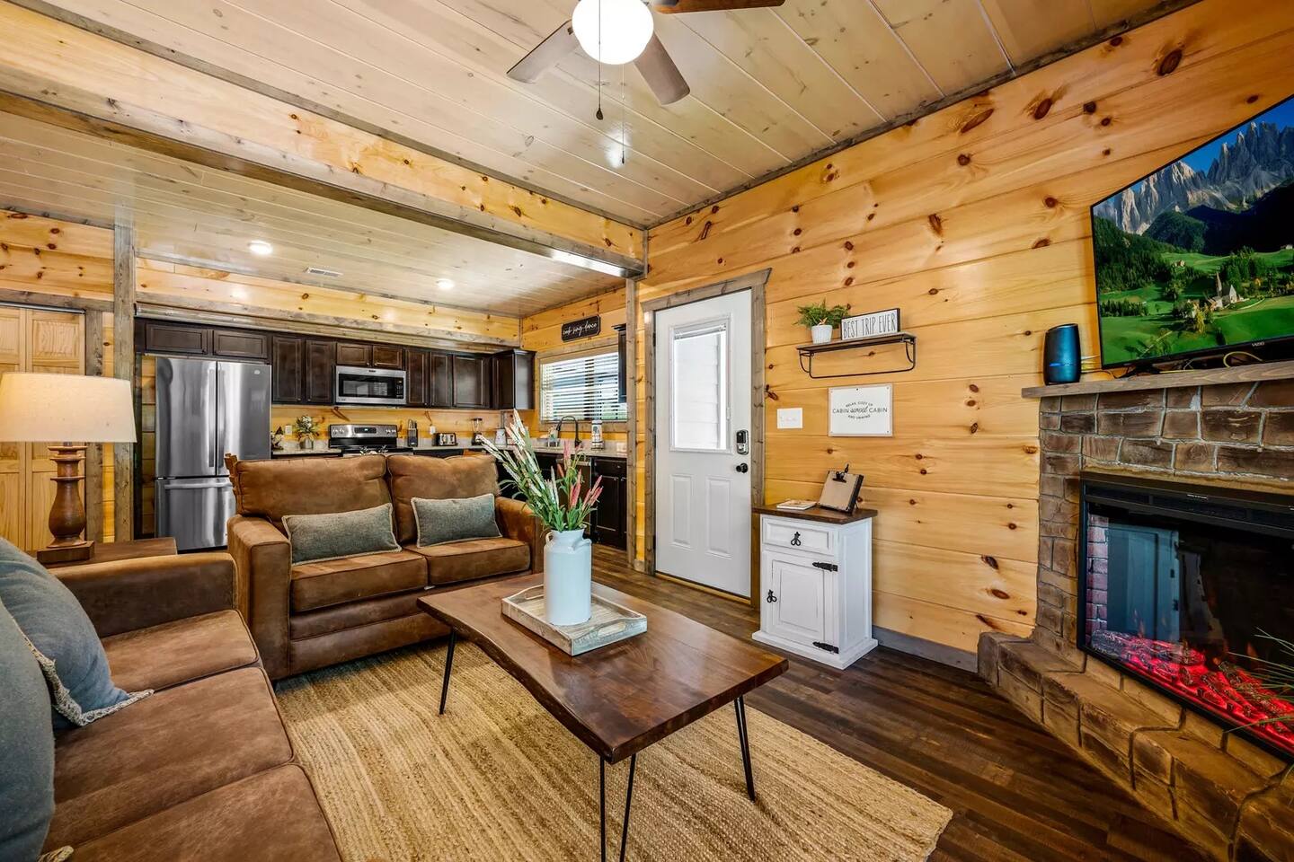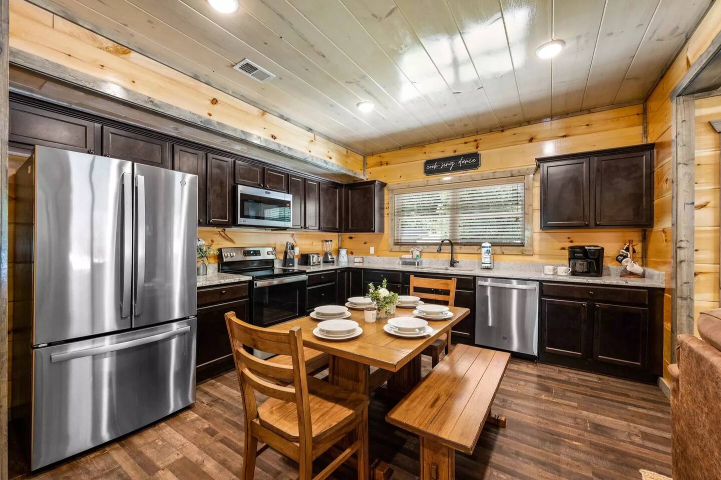 ✨ Cabin Highlights ✨ 🚗 Easy arrival: Paved, level roads, step-free entry, flat parking for up to 4 cars. ♨️ Covered hot tub with direct access from the king suite 🌄 Gentle distant mountain views from 3 covered decks. 🔥 Cozy great room with electric fireplace & big-screen TV. 🍳 Fully stocked stainless kitchen + bench/chair dining. 🐾 Dog-Friendly (max 2 pups) 🛌 Sleep & refresh (3BR • 2.5BA • sleeps 9) ✦Main level King with ensuite bathroom — Enjoy a comfy king-sized bed, Smart TV and private access out to the hot-tub. ✦Main level half bath– for added convenience. ✦Upstairs Queen bedroom —Comfy plush mattress w/ Smart TV ✦Upstairs Bunk room— Spacious room with vaulted ceilings featuring two twin bunk beds + Smart TV ✦Loft futon for an extra guest. ✦Upstairs Bathroom— Full bathroom with large double vanity 🎮 Play & gather Game loft: Golden Tee arcade, air hockey, seating area & TV. Smart TVs in every bedroom (log into your apps). Washer/Dryer on the main level. 🌤️ Outdoors Three covered decks for all-weather lounging with rocking chairs Park-style grill off the patio. (Charcoal Needed) 📍 Close to everything Dollywood 4.2 mi The Island at Pigeon Forge 5.9 mi Soaky Mountain & Wilderness Resort ~4.1 mi Ober Gatlinburg 16.7 mi