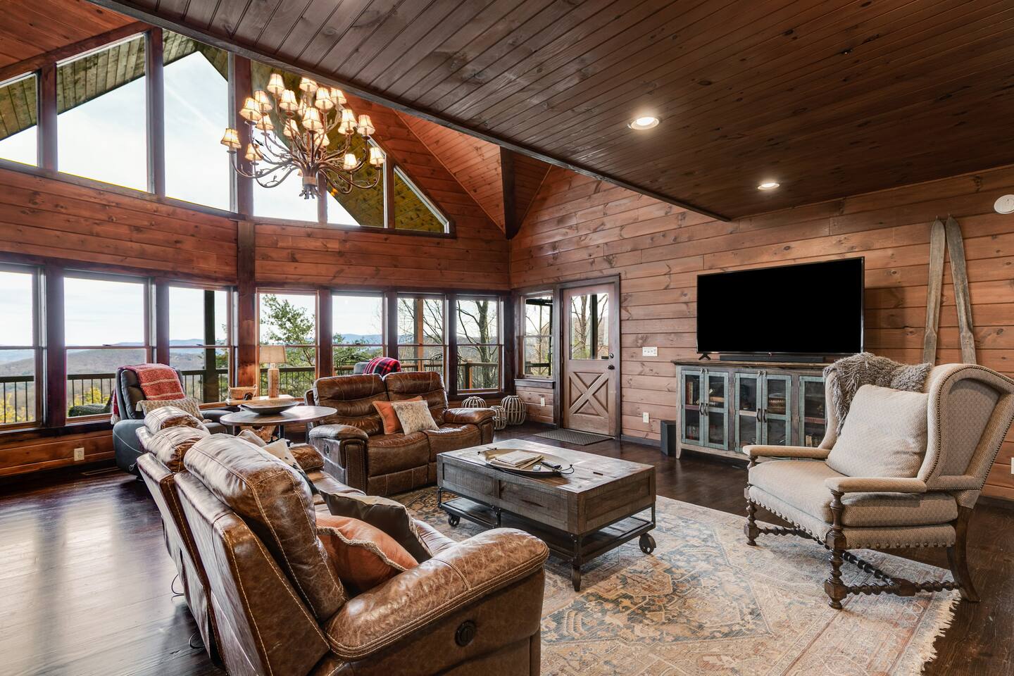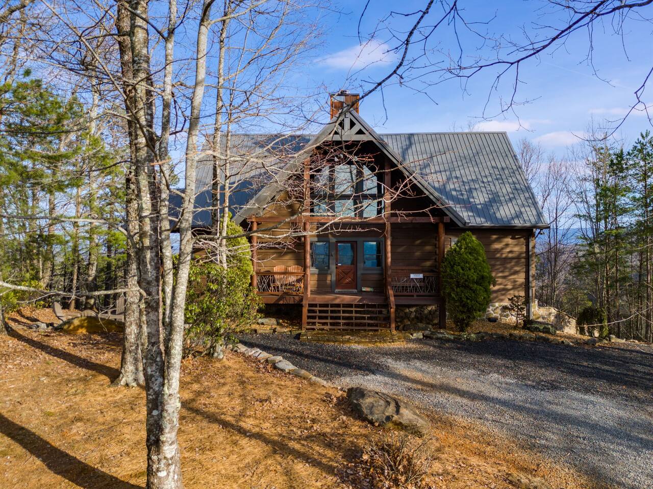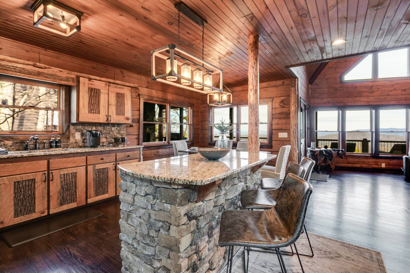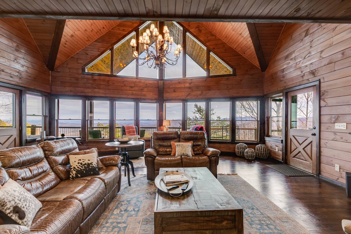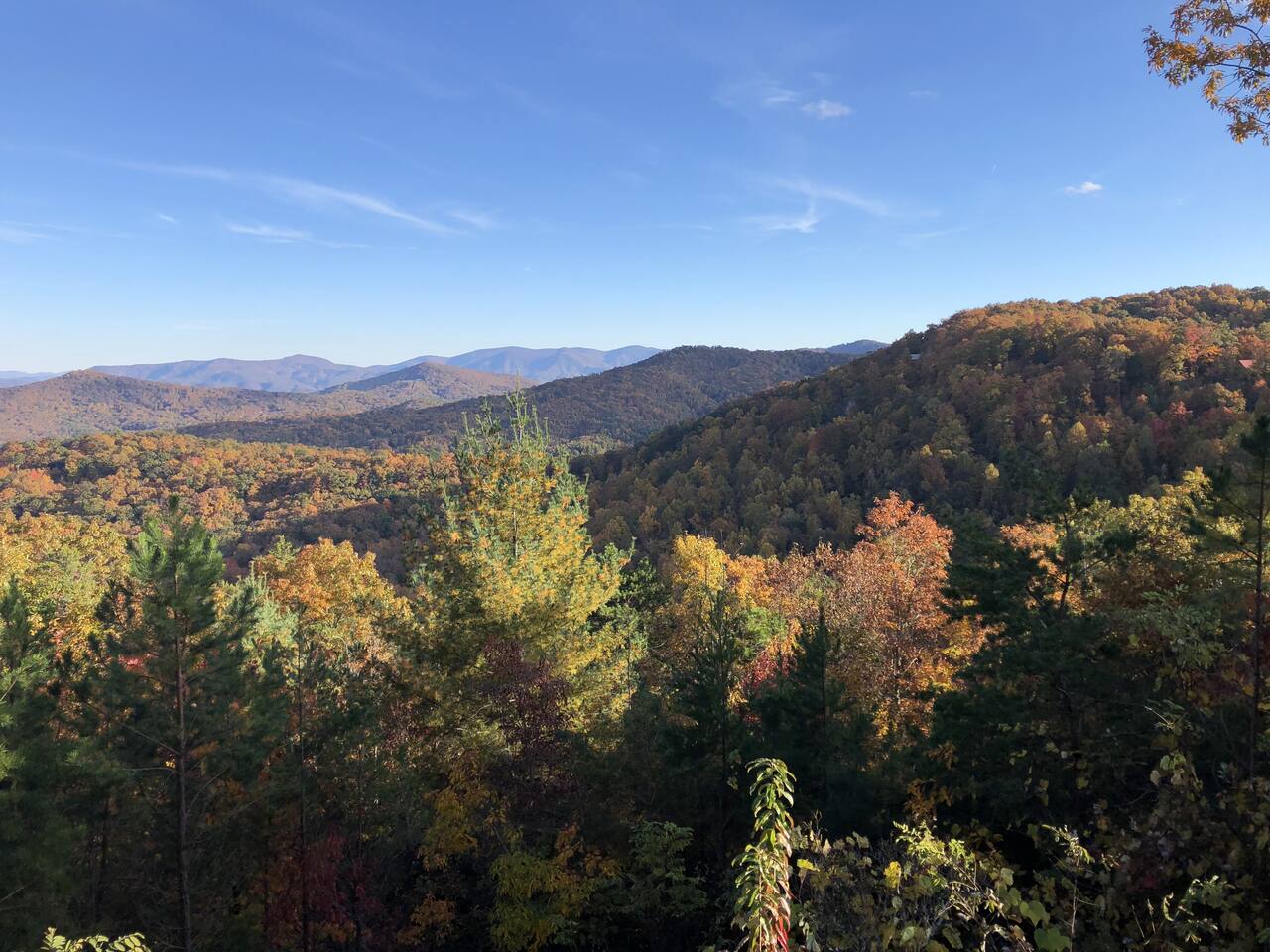 Welcome to ”Cohutta Sunrise” Cabin featuring: ❊Stunning year-round Mountain Views, overlooking the Chattahoochee National Forest. ❊Spacious Accommodations: 5 bedrooms, 4.5 baths, and over 3,600 square feet of living space. ❊Gourmet Kitchen: Fully stocked and equipped with granite countertops, a rustic stone backsplash, and a bar seating area. ❊Private Hot-Tub surrounded by panoramic mountain views. ❊Stone stacked outdoor fireplace with covered seating area ❊2 Expansive outdoor deck areas, screened-in porch with a fan and porch swing, as well as a gas grill for BBQs. ❊2 indoor fireplaces. ❊Luxury Bedding: A king suite with an ensuite bathroom on the main level and multiple comfortable sleeping arrangements throughout. ❊Prime Location: Only 15 minutes from downtown Blue Ridge, combining seclusion with accessibility. ❊Game Room with pool table, giant leather sectional, big screen TV, and games!
