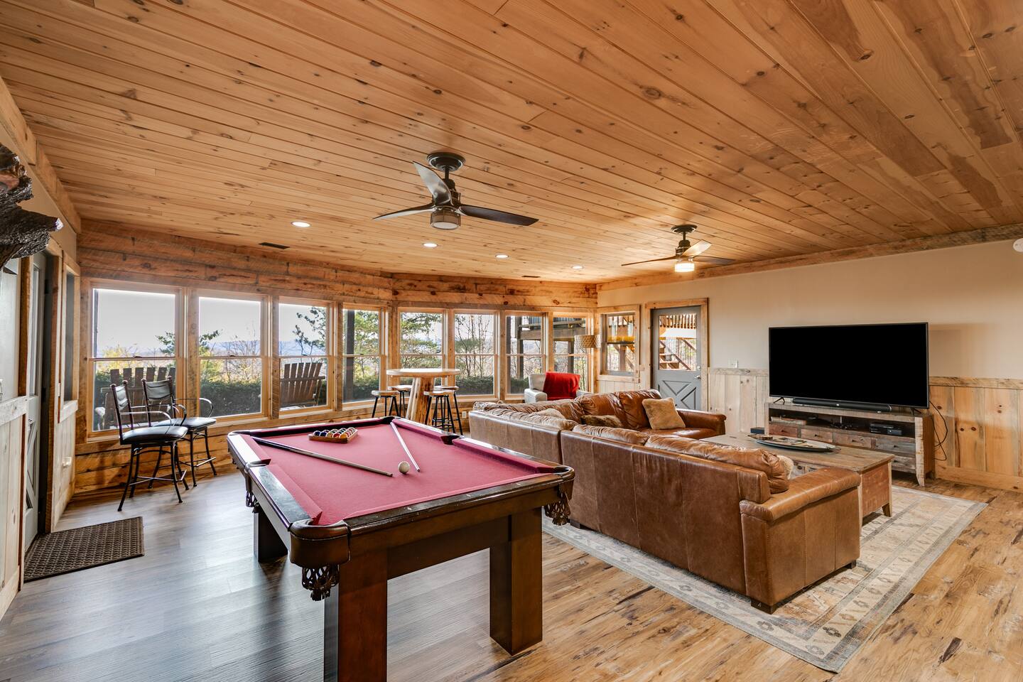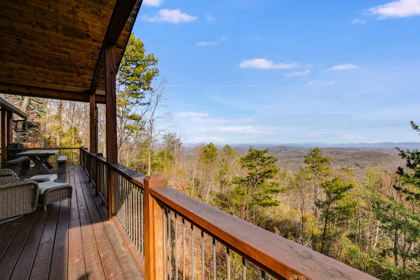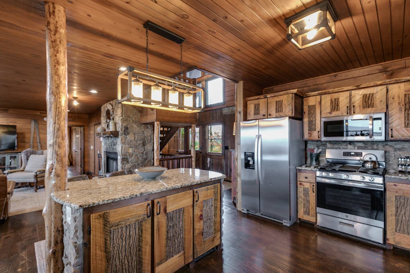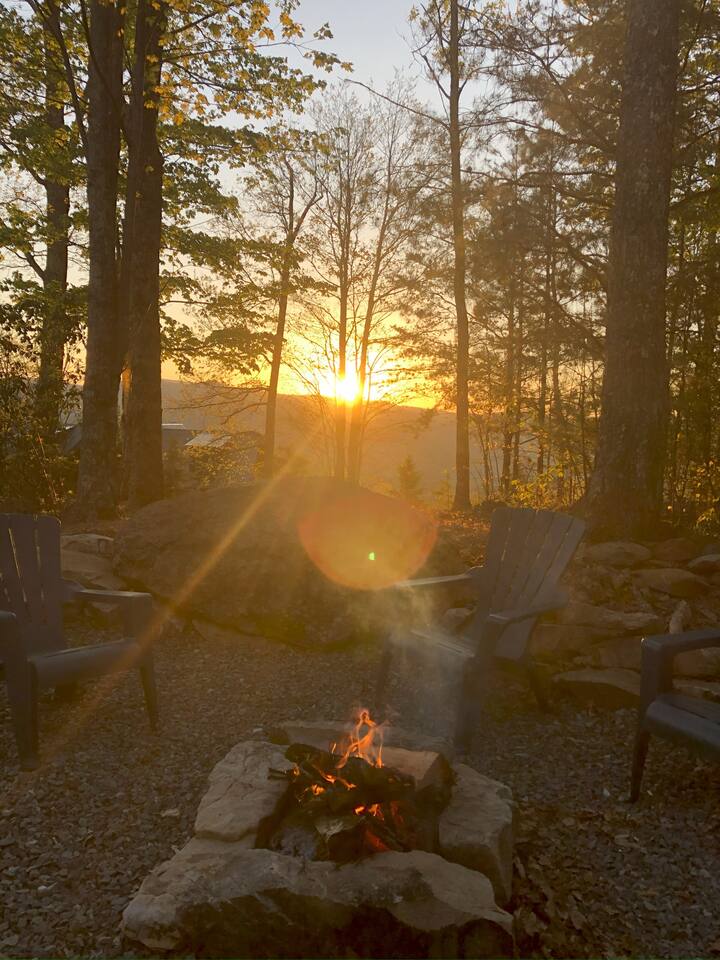 Welcome to ”Cohutta Sunrise” Cabin featuring: ❊Stunning year-round Mountain Views, overlooking the Chattahoochee National Forest. ❊Spacious Accommodations: 5 bedrooms, 4.5 baths, and over 3,600 square feet of living space. ❊Gourmet Kitchen: Fully stocked and equipped with granite countertops, a rustic stone backsplash, and a bar seating area. ❊Private Hot-Tub surrounded by panoramic mountain views. ❊Stone stacked outdoor fireplace with covered seating area ❊2 Expansive outdoor deck areas, screened-in porch with a fan and porch swing, as well as a gas grill for BBQs. ❊2 indoor fireplaces. ❊Luxury Bedding: A king suite with an ensuite bathroom on the main level and multiple comfortable sleeping arrangements throughout. ❊Prime Location: Only 15 minutes from downtown Blue Ridge, combining seclusion with accessibility. ❊Game Room with pool table, giant leather sectional, big screen TV, and games!