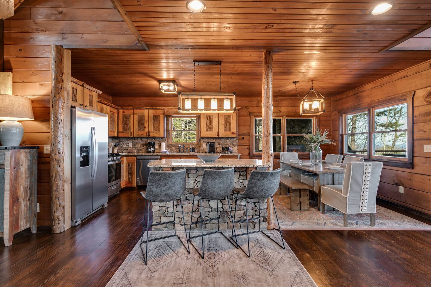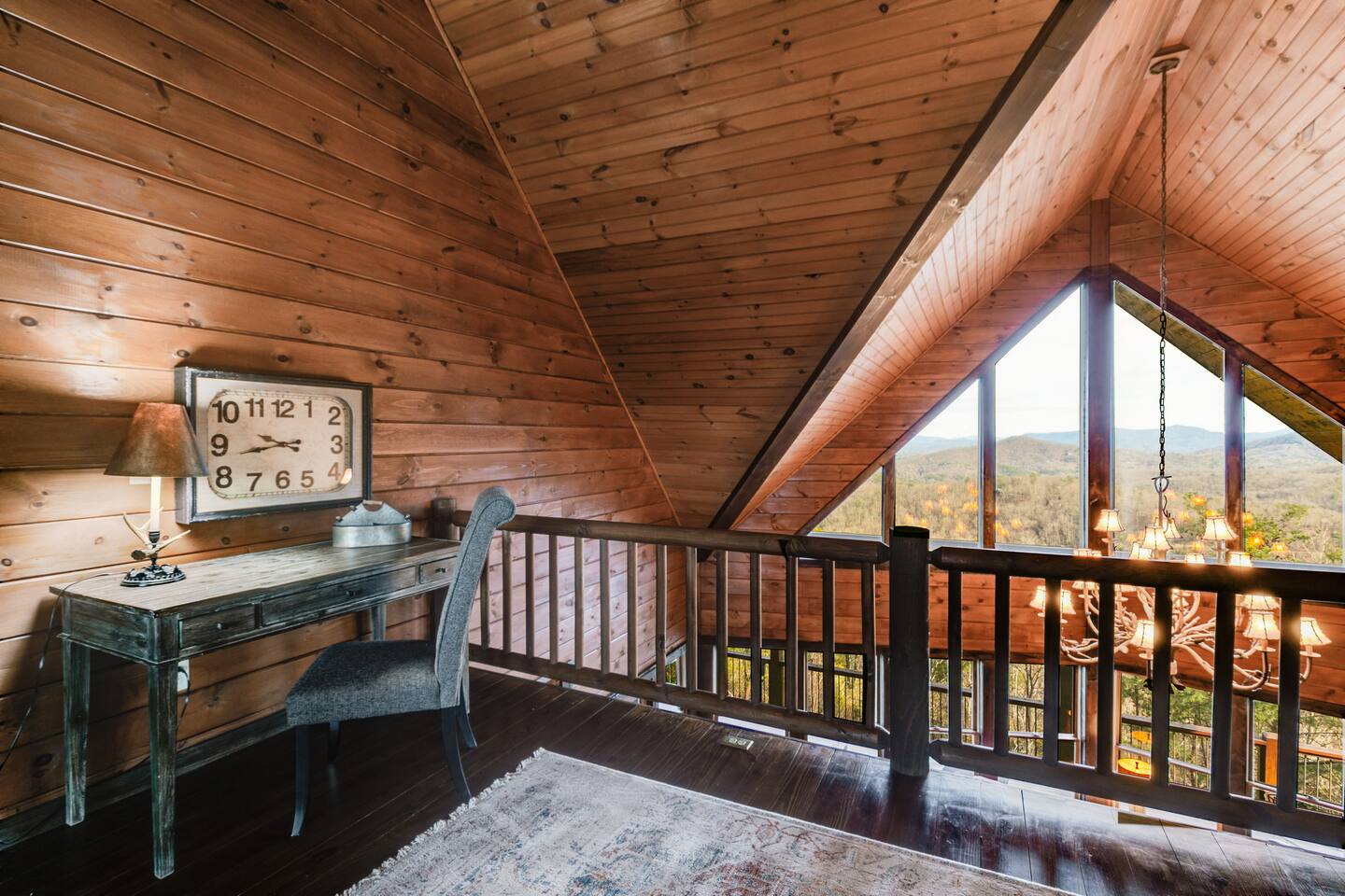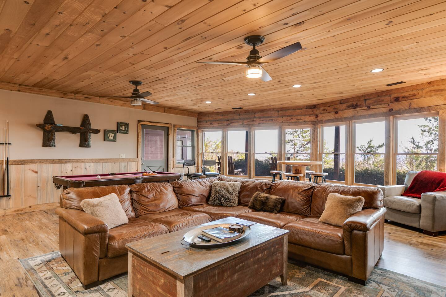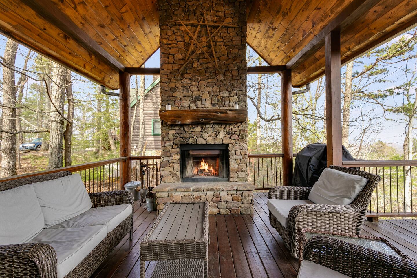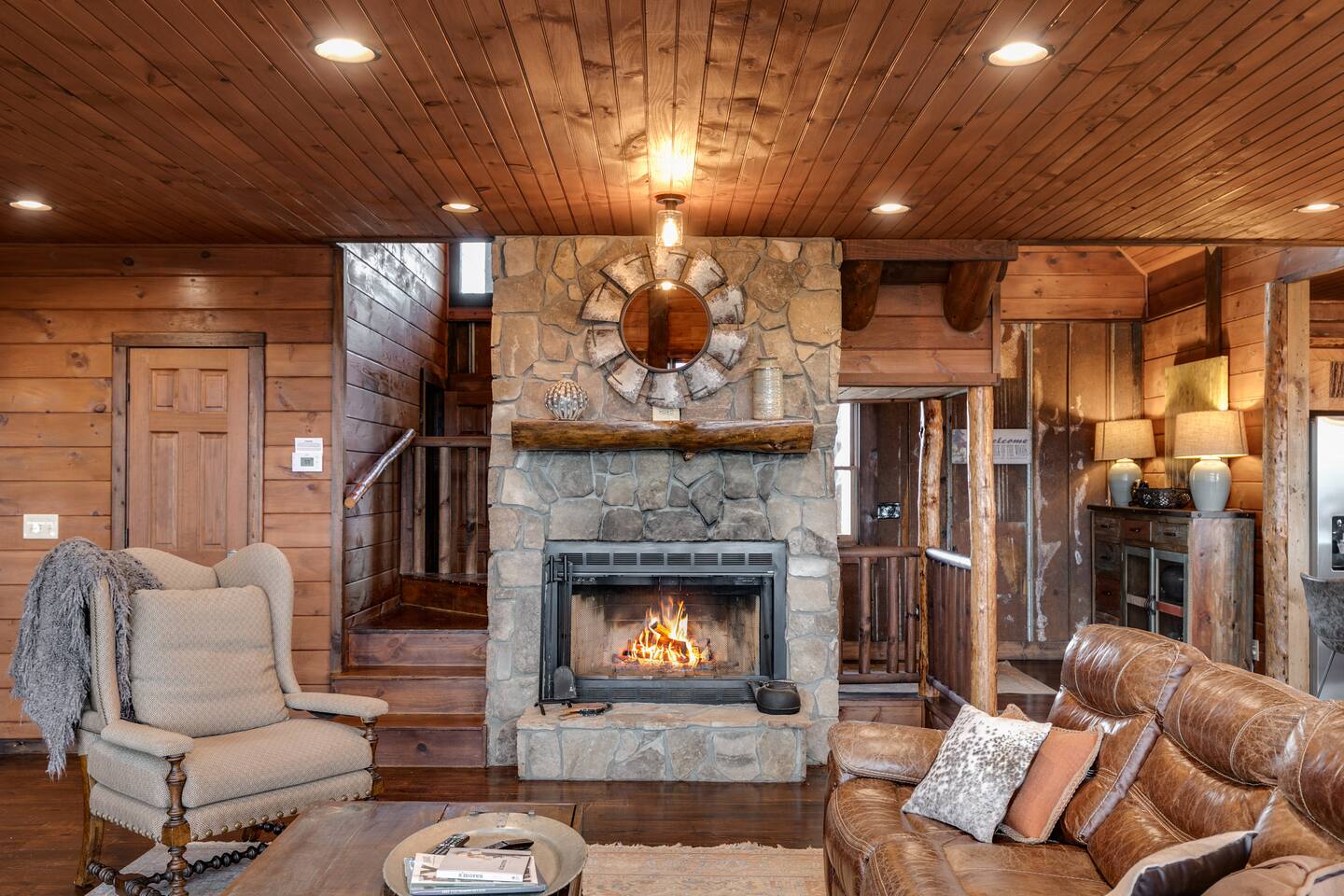 Welcome to ”Cohutta Sunrise” Cabin featuring: ❊Stunning year-round Mountain Views, overlooking the Chattahoochee National Forest. ❊Spacious Accommodations: 5 bedrooms, 4.5 baths, and over 3,600 square feet of living space. ❊Gourmet Kitchen: Fully stocked and equipped with granite countertops, a rustic stone backsplash, and a bar seating area. ❊Private Hot-Tub surrounded by panoramic mountain views. ❊Stone stacked outdoor fireplace with covered seating area ❊2 Expansive outdoor deck areas, screened-in porch with a fan and porch swing, as well as a gas grill for BBQs. ❊2 indoor fireplaces. ❊Luxury Bedding: A king suite with an ensuite bathroom on the main level and multiple comfortable sleeping arrangements throughout. ❊Prime Location: Only 15 minutes from downtown Blue Ridge, combining seclusion with accessibility. ❊Game Room with pool table, giant leather sectional, big screen TV, and games!