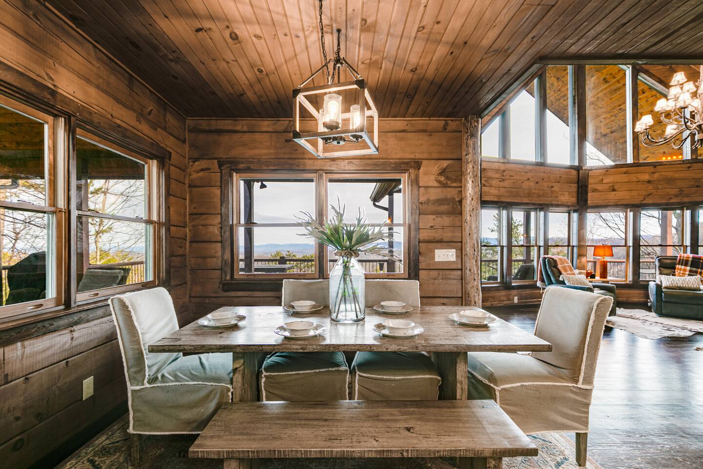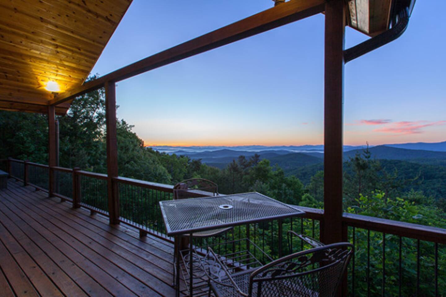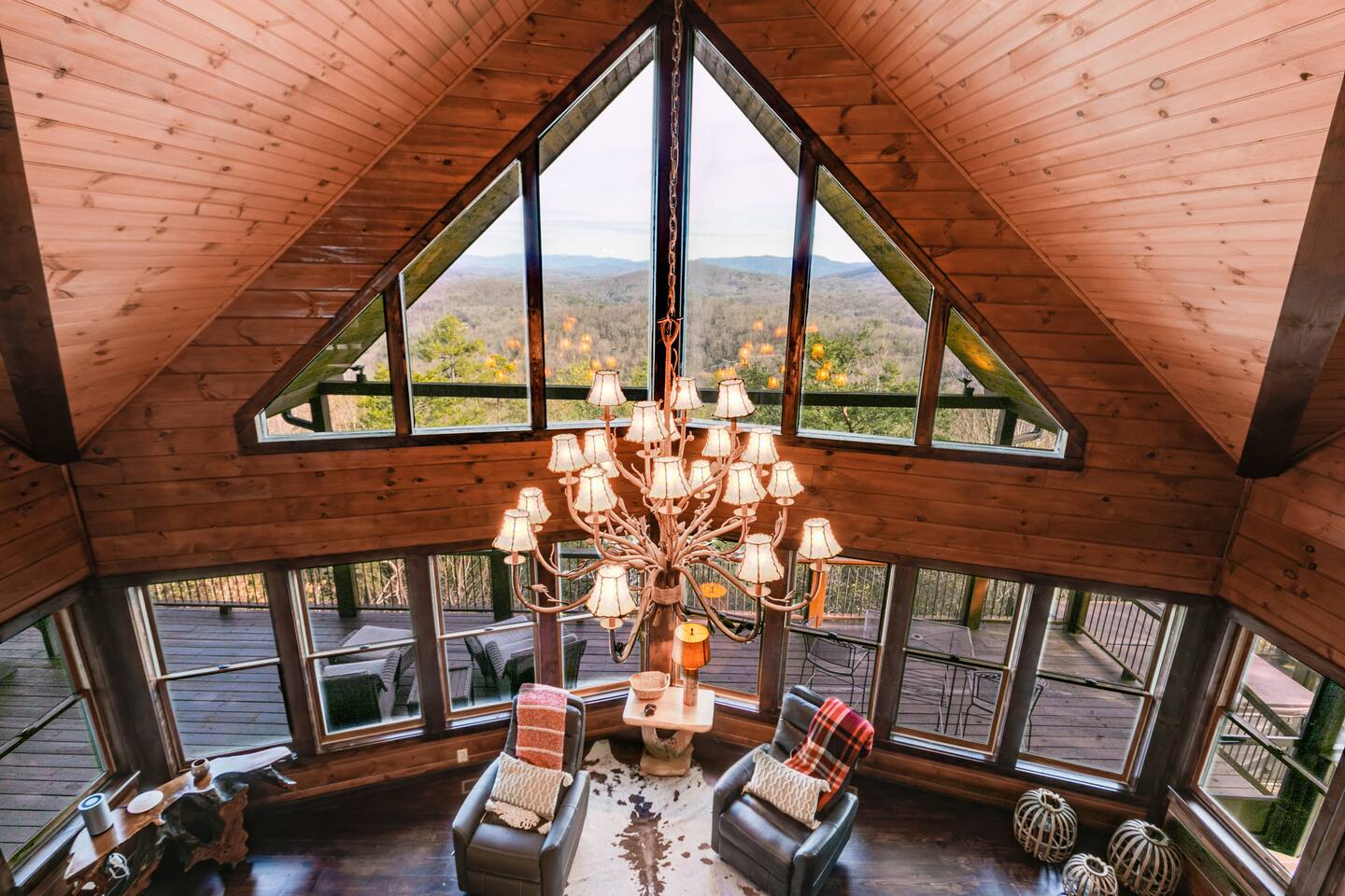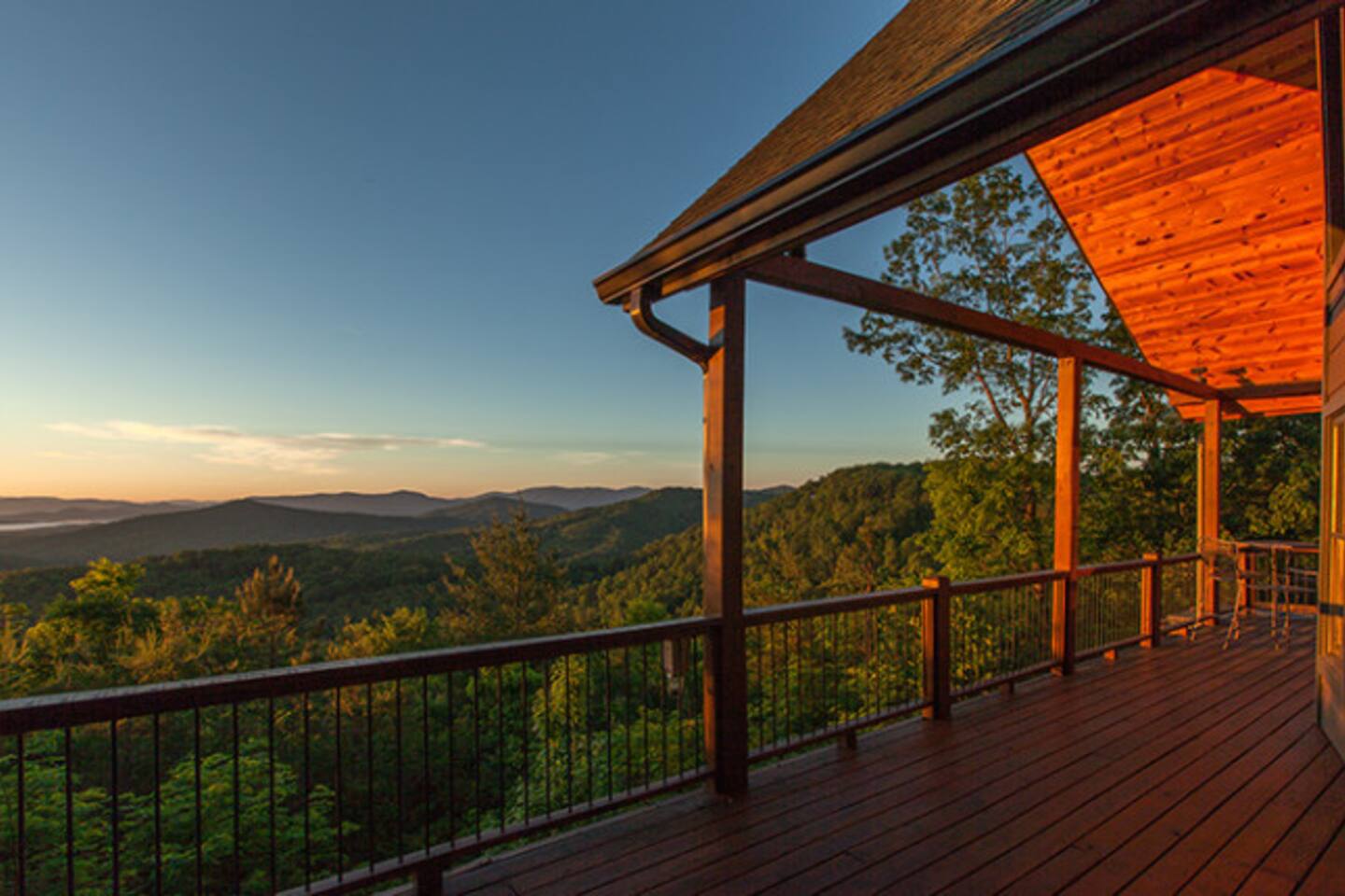 This stunning 3,600 sqft custom built luxury mtn top cabin has amazing long range 60+ mile panoramic views of the North Georgia MTNs to the East and the Cohutta Wilderness Area to the west! Enjoy incredible sunsets and sunrises from 2 expansive decks or through the floor-to-ceiling windows in the living area. Features a fully loaded chefs kitchen, hot-tub, pool table & outdoor fireplace. Just 15 minutes from downtown Blue Ridge, this is the perfect retreat for family gatherings!