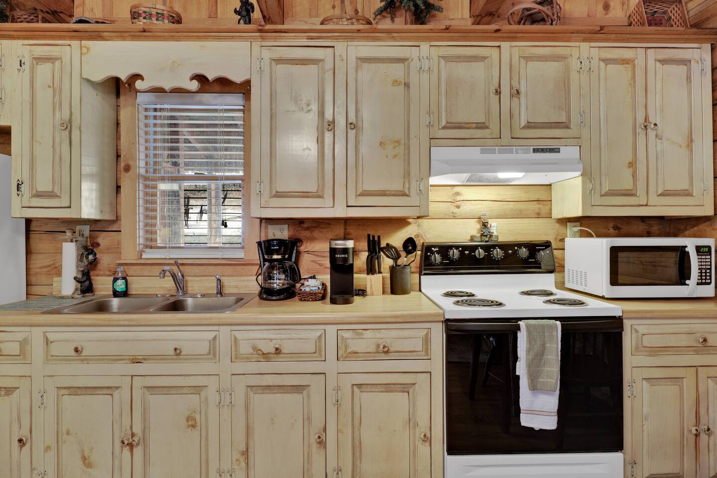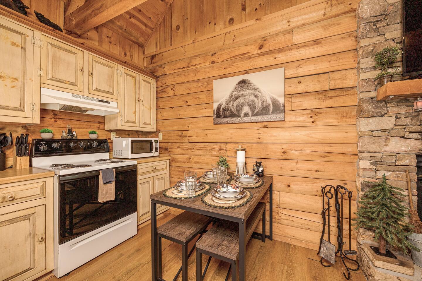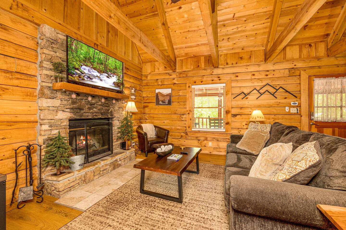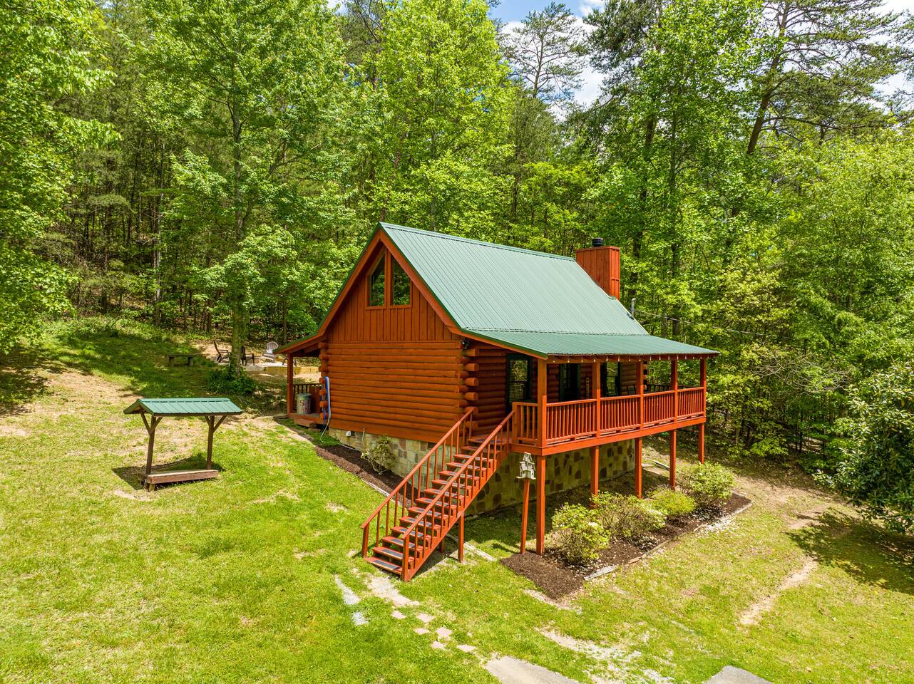 Discover your perfect Smoky Mountain getaway in this charming, semi-secluded log cabin nestled in the heart of Sevierville, Tennessee! Just minutes from Pigeon Forge and the stunning Great Smoky Mountains National Park, this rustic retreat offers an idyllic escape for couples, honeymooners, and small families alike. Surrounded by nature, you'll enjoy ample privacy and tranquility, with all the modern conveniences you could ask for. Step inside this beautifully appointed cabin, where you'll be greeted by a spacious open floor plan adorned with rustic charm and tasteful décor. The cozy living room features a wood-burning fireplace and large flat-screen Roku TV, perfect for a relaxing night in. Unwind on the comfortable queen-sized sleeper sofa, while staying connected with high-speed internet throughout the property. The cabin's loft boasts a pool table, dart board, and an assortment of board games, providing endless entertainment for all ages. Prepare a delicious meal in the fully equipped kitchen, complete with all the cooking essentials and small appliances you need, including a Keurig coffeemaker. Retreat to the master bedroom, where you'll find a luxurious king-sized bed, smart TV, and a convenient washer/dryer. Freshly cleaned towels and starter toiletries are provided for your comfort. Step outside onto the large front porch, where you can enjoy a peaceful morning on the swing or rocking chairs, taking in the beauty of your surroundings. The private, wooded back patio offers a serene setting for an evening soak in the hot tub or grilling on the outdoor propane grill. Gather around the fire pit, nestled among Adirondack chairs, and create unforgettable memories under the stars. With its prime location, ample amenities, and inviting atmosphere, this enchanting log cabin is the ultimate home-away-from-home for your next Smoky Mountain adventure.