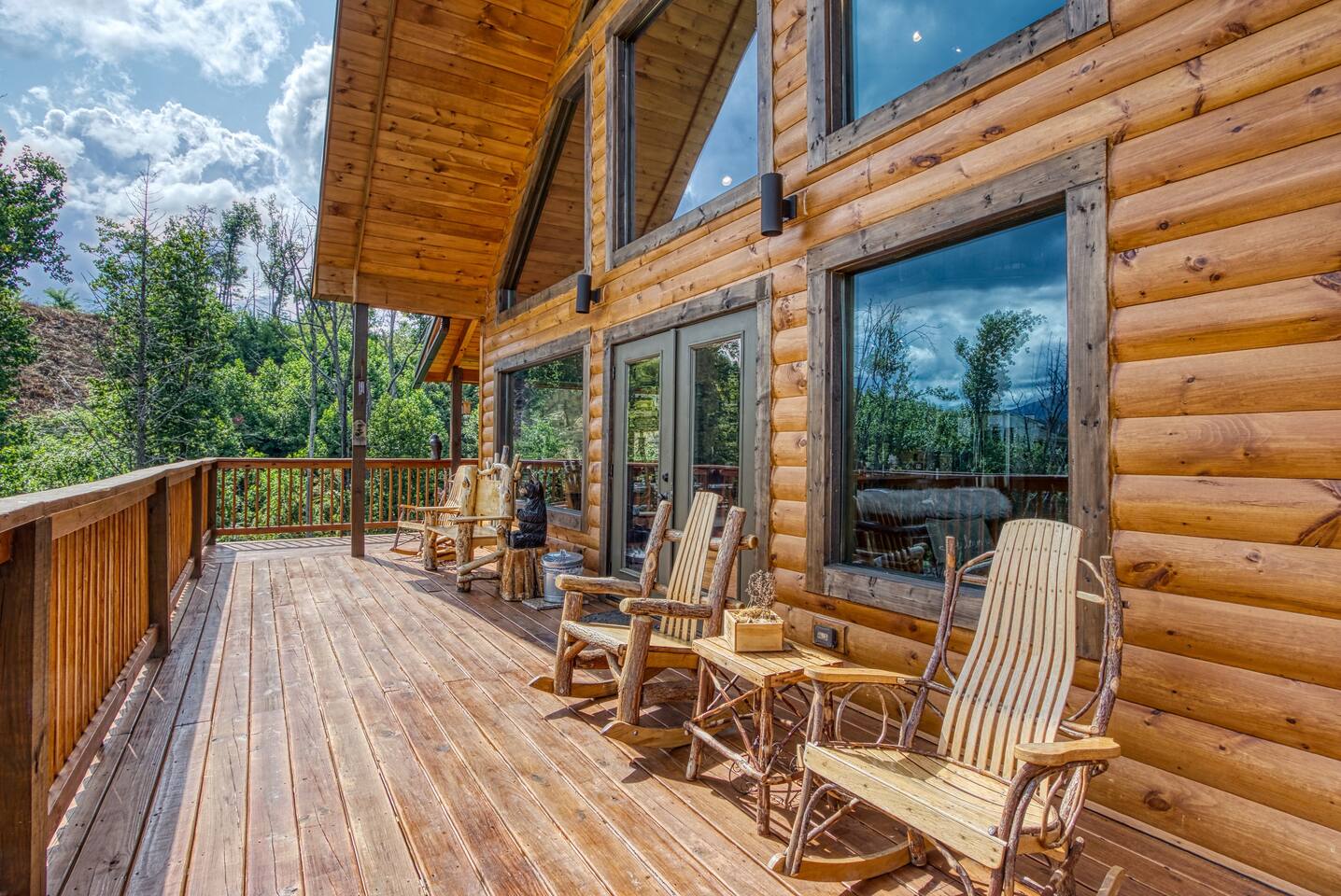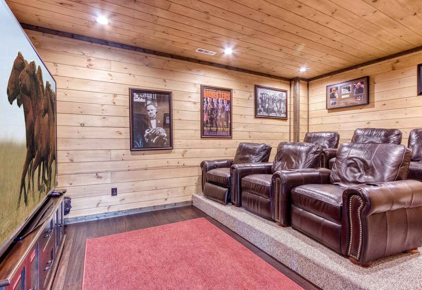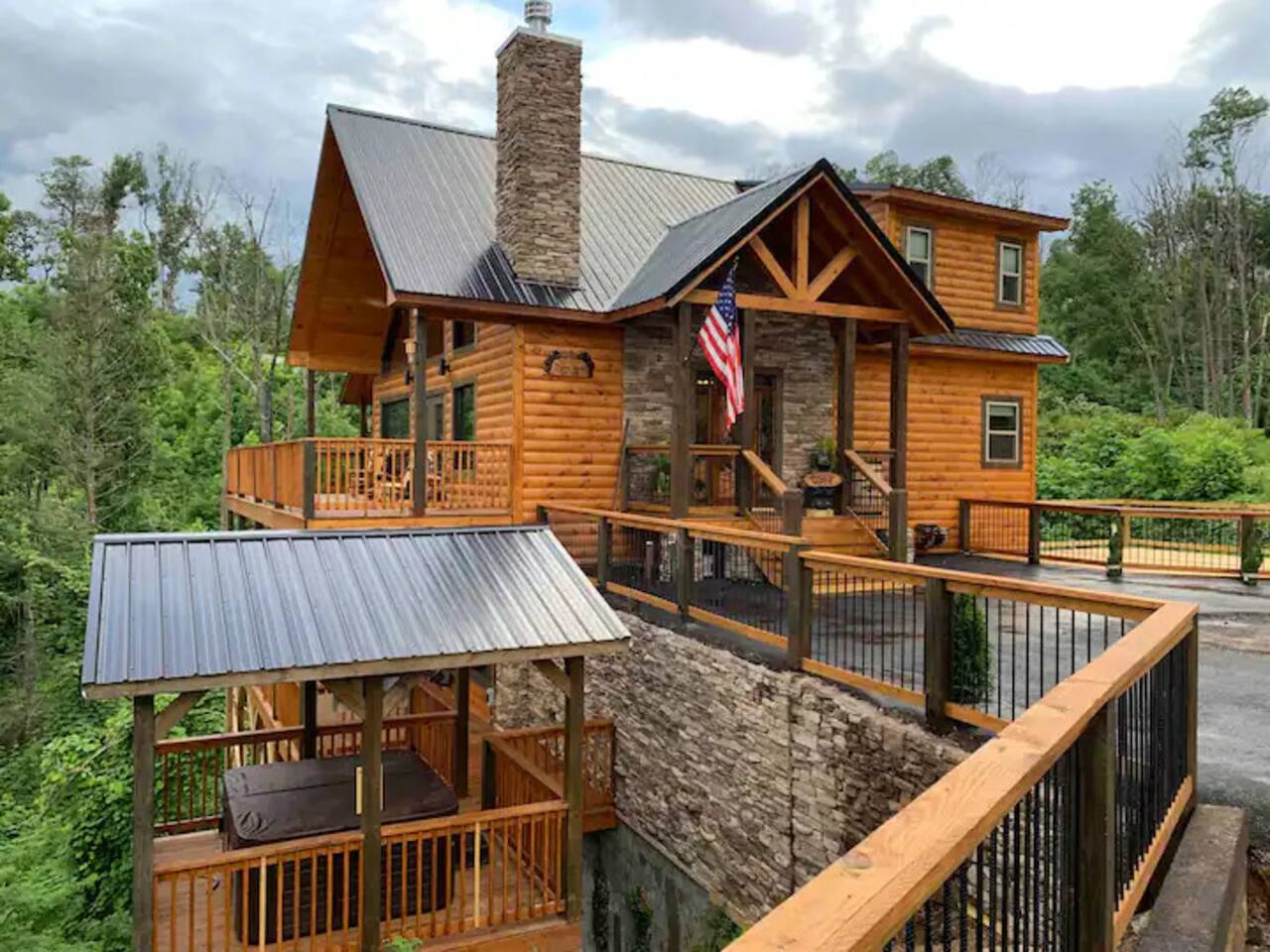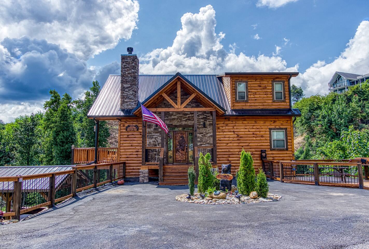 🌟Key Features 🏔️ Unmatched panoramic mountain views 🎬 Private theater room with tiered seating for movie nights 🕹️ Epic game room with foosball table, arcade games & pool table 🍷 Luxury “Man Cave” with wet bar 🛁 Covered outdoor hot tub with scenic mountain backdrop 🛌 Spa-like king suite with jacuzzi tub, walk-in shower & deck access 🪵 Massive wraparound decks with log rocking chairs & swing 🔥 Stone-stacked gas fireplace in a soaring great room 🍽️ Fully loaded chef’s kitchen with stainless steel appliances & views 📶 High-speed Wi-Fi + cable & satellite TV for work or entertainment 🧺 In-cabin laundry and 3 full bathrooms 🏊 Community pool & clubhouse access in Chalet Village 🎿 Close to ski areas, tennis courts, and Gatlinburg attractions This stunning cabin is situated just 3 miles from Downtown Gatlinburg and 7 miles from Pigeon Forge, Shadow Woods is centrally located and close to everything. The Cabin is Minutes away from the Ski Resort Ober Gatlinburg, and whatever adventures you wish to undertake. Minutes From Hiking Trails, Underground Caverns, Zip-lines, Water-rafting, Dollywood, & a multitude of activities at your disposal. Our 2,700 square foot luxury cabin comfortably accommodates up to 10 guests. This luxury cabin offers 2 King beds, 1 Queen bed, and 2 twin bunk beds (sleeps 4). Additionally, each room has its own flat screen TV. As you enter the cabin, you will be captivated by stunning windows offering you a million dollar view, Bringing the Smokies mountains into the Cabin with you. Ready for some fun and games? The downstairs game room and den also has a , a wet bar, a game table which offers both a pool table, air hockey table, & a movie Theatre . The lower deck also features a Gazebo with a hot tub, so you can enjoy views of Mountain, all while soaking in the hot tub! For our guests who must stay connected we offer a free 100 mbps wireless internet connection and cable TV through Charter Spectrum. Two minutes down the road, during the season our guests have access to the Association Clubhouse that features a huge swimming pool, as well as tennis courts. During the winter, our location on Ski Mountain makes access to the ski slopes of Ober Gatlinburg an easy 7 minute drive. Downtown Gatlinburg is a short 4-mile drive and offers shopping, fabulous restaurants, and tourist attractions that will keep everyone entertained.