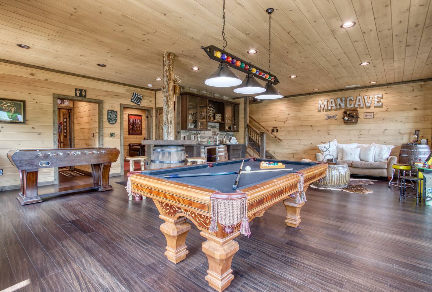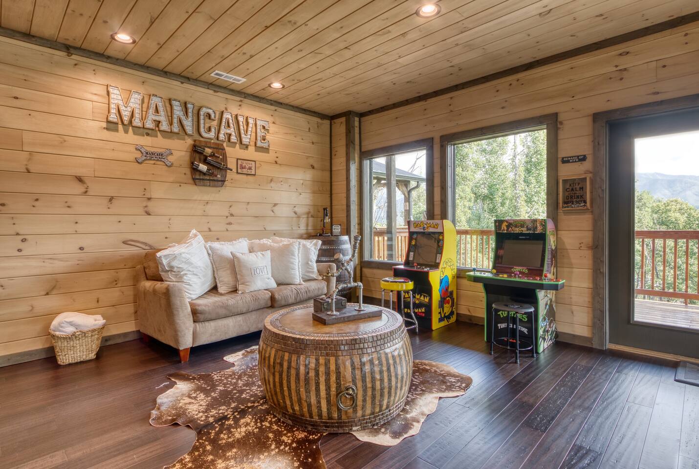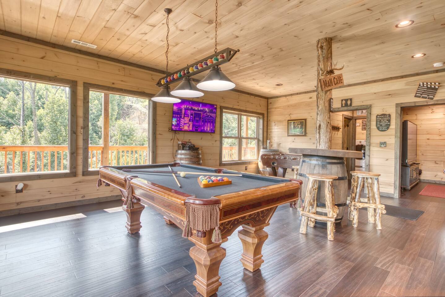 Shadow Woods is a Brand new 3 bedroom, 3 Bath luxury cabin with a modern twist designed for families who wish to relax and enjoy what the Smokey Mountains have to Offer. Shadow Woods offers unbeatable scenic views to enjoy throughout your stay! In addition to these beautiful views, we offer luxurious amenities including high speed internet, in cabin laundry, game room, pool table, cable, satellite, theater Room, fireplace, jacuzzi and a very nice Man Cave for your hubby to relax and enjoy.