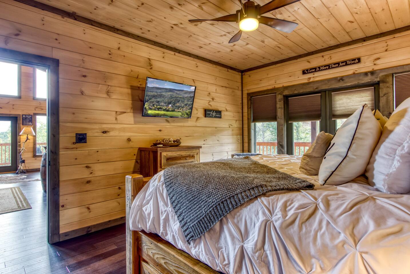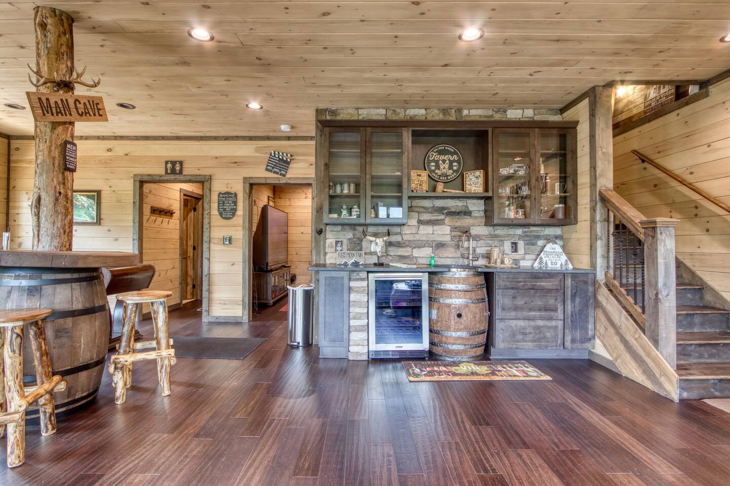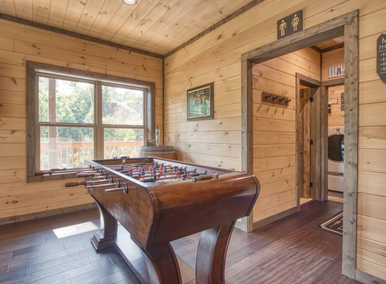 Shadow Woods is a Brand new 3 bedroom, 3 Bath luxury cabin with a modern twist designed for families who wish to relax and enjoy what the Smokey Mountains have to Offer. Shadow Woods offers unbeatable scenic views to enjoy throughout your stay! In addition to these beautiful views, we offer luxurious amenities including high speed internet, in cabin laundry, game room, pool table, cable, satellite, theater Room, fireplace, jacuzzi and a very nice Man Cave for your hubby to relax and enjoy.