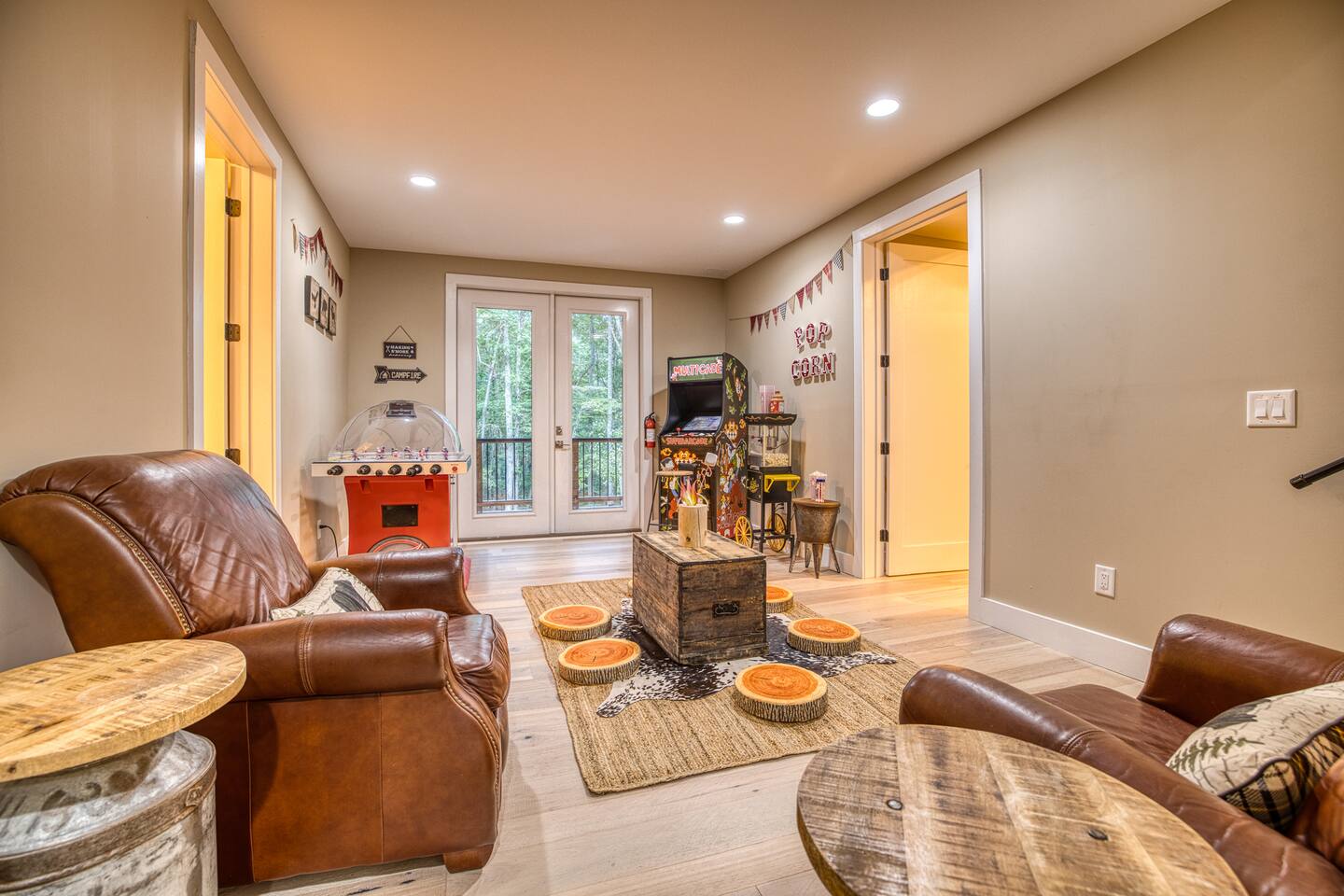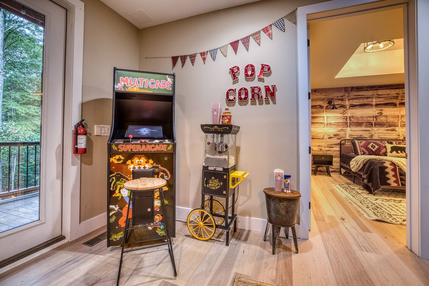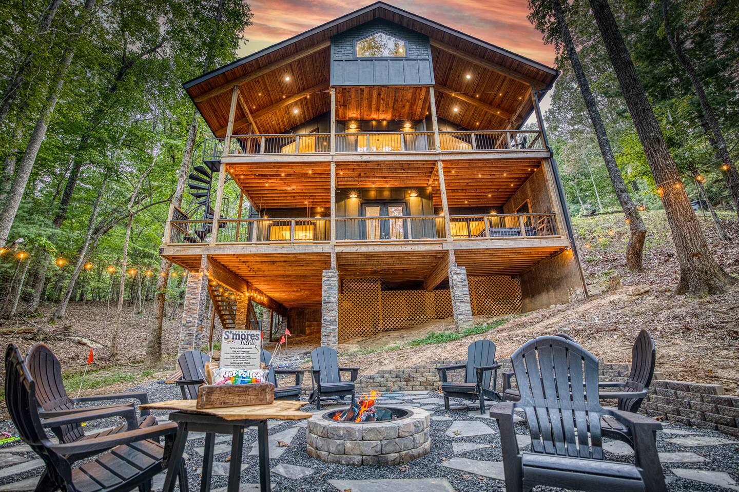 ✨ Cabin Highlights ✨ 🛏️ 3 King Suites + double Loft (sleeps 10 comfortably) 🔥 Wood-Burning Fireplace in open living room 🛁 Hot Tub w/ Roku TV for stargazing soaks 🎮 Arcade Games + Bubble Hockey for nonstop fun 🌲 3 Private Wooded Acres w/ new fire pit, Adirondack chairs & lawn games! 🍿 Popcorn Maker, Record Player & Board Games for family nights 🐾 Dog-Friendly (max 2 pups) 🍽️ Fully Stocked Kitchen + outdoor grill & dining area 🛋️ Spacious Double Decks + outdoor bed swing ✨Tucked away on 3 private wooded acres between Blue Ridge and Blairsville, this 3,000 sq ft custom luxury cabin blends modern comfort with a cozy treehouse vibe. Whether you’re planning a family getaway, a couples’ retreat, or a friends’ adventure, this spacious home is designed for relaxation, fun, and unforgettable mountain memories. 🛏️ Sleeping Arrangements (Sleeps 10 Max) Bedroom 1: King bed + Roku TV Bedroom 2: King bed + Roku TV Bedroom 3: King bed + Roku TV Bedroom 4 (Loft): 2 twin beds w/ trundles + Roku TV Bedroom 5 (Loft): 2 sofa beds, cozy hangout space (no TV) Every king bedroom has its own Roku TV, plus TVs in the loft, at the hot tub, and on the main deck for entertainment anywhere you relax. 🔥 Cabin Comforts Open-concept living room with a wood-burning fireplace and vaulted ceilings Spa-inspired master ensuite with granite counters and luxury finishes Dog-friendly (max 2 pups!) so your furry friends can join the adventure 🍳 Fully Stocked Kitchen Full dishware & utensils set for 10 guests Pots, pans, bakingware, crockpot, blender, mixer & more Wine glasses for evenings by the fire Drip coffee maker to start your mornings right 🎮 Endless Entertainment Arcade multicade with classics NHL bubble hockey Dart board, frisbee golf, corn hole, board games & books Popcorn maker + supplies for family movie nights Record player & Bluetooth speakers for retro vibes 🌲 Outdoor Fun & Relaxation Expansive double-level decks with seating & Roku TV Outdoor dining table for 6–8 guests Outdoor bed swing for lazy afternoons Hot tub under the stars with its own Roku TV Brand new custom fire pit area with Adirondack chairs — perfect for s’mores & stargazing Propane Grill for BBQ nights