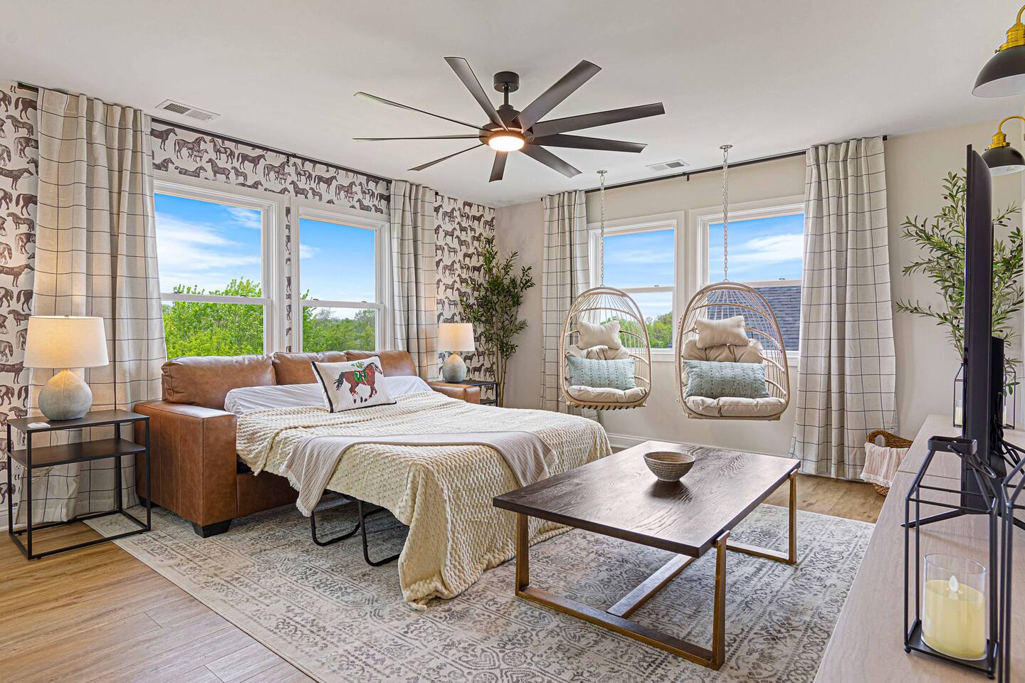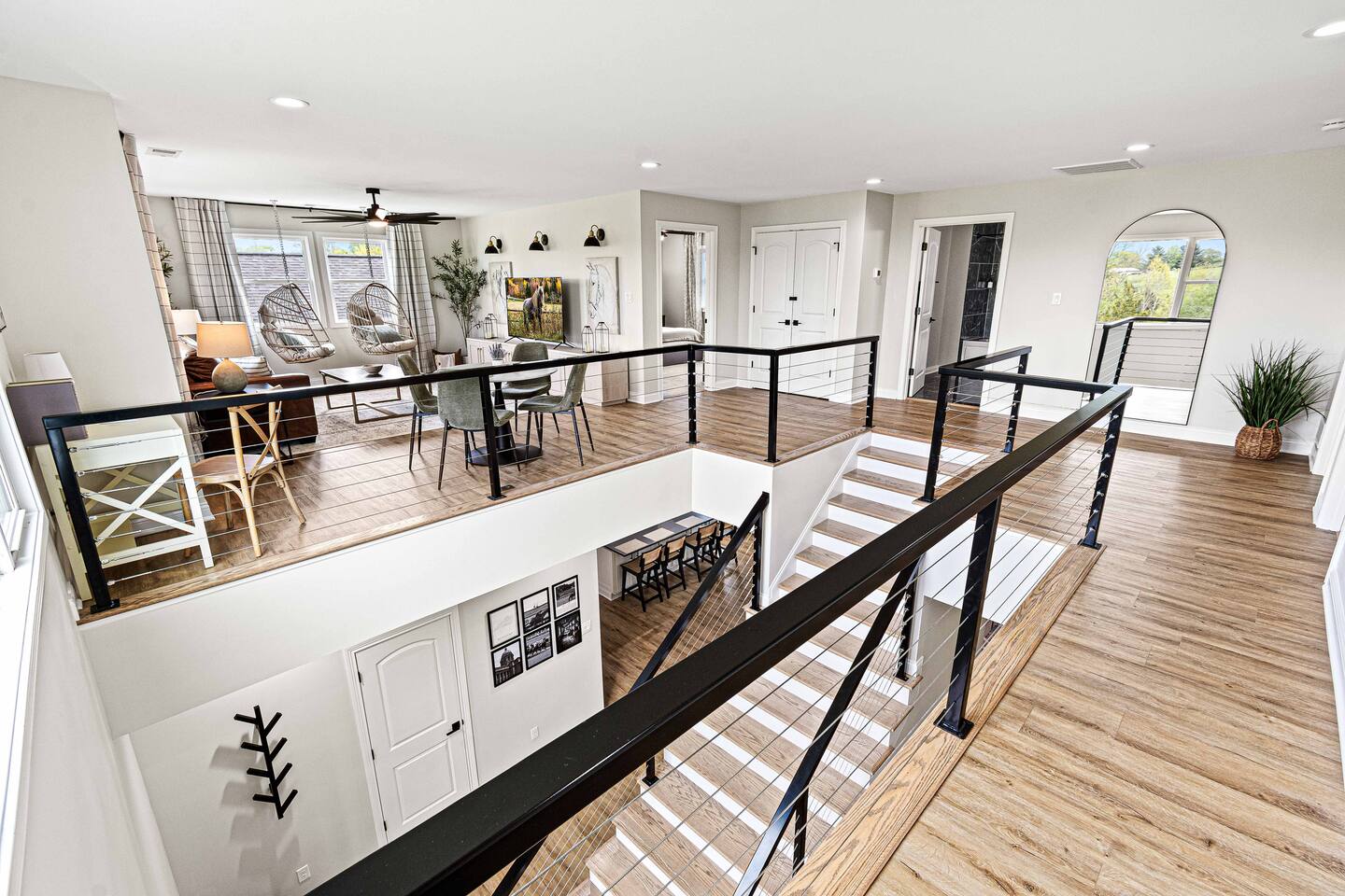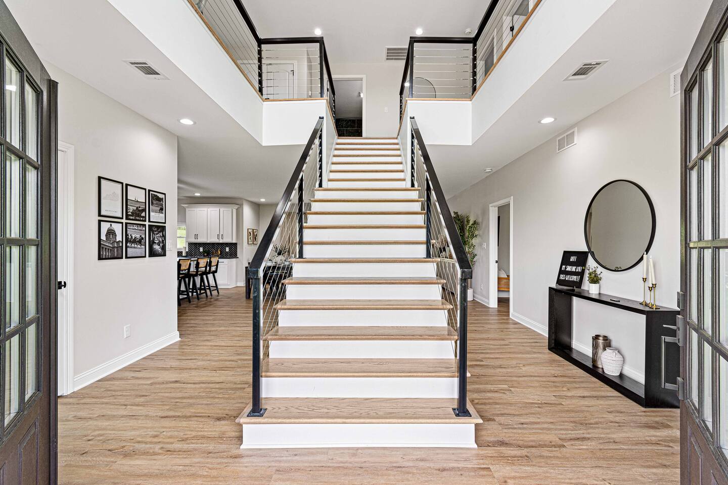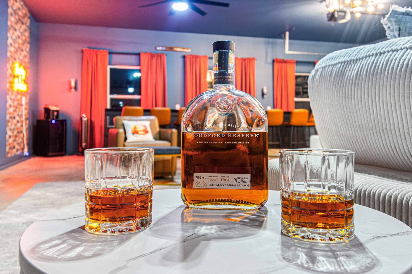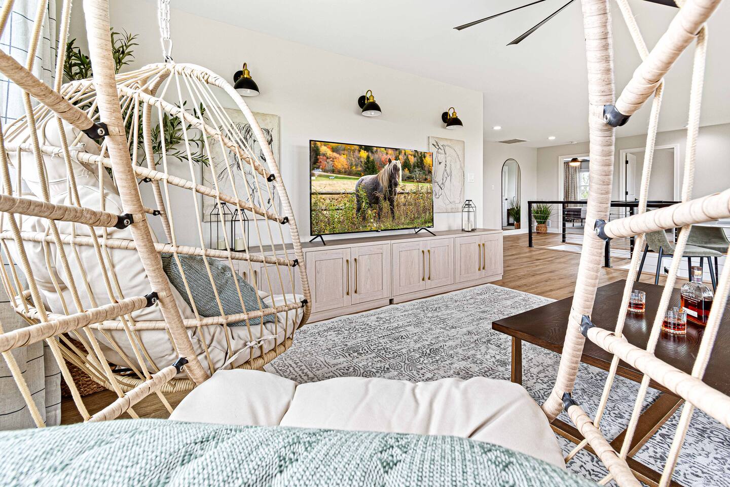 ★★★★★ "We thoroughly enjoyed the hot tub and spent evenings by the fire pit and in the well equipped game room!" ❊Massive Game Room ❊5 acres of seclusion ❊Large Bar, mini fridge, ice maker and all of the barware needed to mix up your favorite beverages! ❊Pool table, shuffleboard, foosball, poker table ❊Massive 85-inch smart TV surrounded by large sectional ❊2 65-inch Roku TVs in both main living room and upstairs loft ❊Covered 6-person Hot Tub ❊2 covered patios with seating areas ❊Large backyard fire pit overlooking the rolling hills ❊Horseshoe pit, corn hole and bocce ball. ❊Propane grill w/ utensils ❊Fully loaded kitchen with brand new stainless-steel appliances ❊Keurig, French Press, & tea kettle ❊Large 8-person dining table alongside 4-person island seating area ❊Full size washer/dryer This 4 Bedroom/2.5 bath can accommodate up to 12 people comfortably. Nestled amidst the picturesque landscape of semi-rural KY, our house is a tranquil haven away from the hustle and bustle of city life. Enjoy privacy and seclusion on 5 acres of rolling hills while being just minutes from some of Kentucky’s most famous distilleries along the Bourbon Trail, including Buffalo Trace, Bulleit and Jeptha Creed! Explore the charm of nearby towns with just a short drive to Frankfort, Shelbyville, and easy access to both Louisville and Lexington! This property is equipped with endless activities and amenities for you to enjoy with friends & family. Soak in the brand-new 6-person hot tub, or roast marshmallows in the massive backyard firepit beneath the string lights in full seclusion. Challenge your friends to endless games ranging from billiards, shuffleboard, foosball, poker, horseshoes, and corn hole. After a long day, kick back and enjoy a movie on the 85-inch flat screen TV within the massive game room. ✦Kitchen✦ Love coffee? We have you covered with a Keurig Duo, French Press, tea kettle, k-cups, ground coffee, creamers, and tea! Embrace your inner chef and prepare delicious meals in the fully loaded kitchen, featuring black leathered granite countertops, brand-new stainless-steel appliances and all essential cookware. ✦Sleeping Accommodations✦ ✦Primary Suite: This main level bedroom contains a King bed with a luxury memory foam mattress and high-quality linens to ensure a great night's sleep! Enjoy the massive walk-in closet, and a 50” Roku smart TV. The en-suite bath comes complete with a double vanity, and walk-in shower. For your convenience, we've taken care of your toiletry needs. Shampoo, conditioner, toilet paper, makeup towels and a hairdryer are provided. ✦Upstairs Bedrooms 2 & 3 each offer a comfortable, plush king-sized bed, luxury linens, a smart Roku TV, and a walk-in closet for convenience. ✦Bedroom 4: This spacious bedroom features two Queen beds each with a comfortable memory foam mattress and luxury linens! ✦Upstairs loft with Queen Size sleeper sofa: Unwind in a Kentucky Farmhouse themed loft, featuring hanging chairs, stylish wallpaper, 65-inch Roku TV and card table for entertainment. Extra Sleeping Space: The queen sleeper sofa provides additional sleeping accommodations for guests. ✦Upstairs Bathroom: The upstairs hallway bathroom features a large double vanity, shower/tub combo, shampoo, conditioner, makeup towels and a hairdryer are provided for your use. Escape to our Modern Farmhouse Retreat and experience the best of Kentucky's bourbon country in style and comfort. Book your stay now and make unforgettable memories in this enchanting destination! ✦Nearby Distilleries✦ ∗Bulleit Distilling Co ∗Three Boys Farm Distillery *Whiskey Thief Distilling Co *The Barrel Room *The Last Stope Brewing ∗Buffalo Trace Distillery: One of the most famous distilleries in Kentucky! *Glenn's Creek ∗Jeptha Creed Distillery: tours and tastings of their craft spirits, including vodka, moonshine, and bourbon. ∗Castle & Key Distillery: Castle & Key Distillery is housed in a historic property with beautifully restored gardens. Visitors can take guided tours of the distillery and enjoy tastings of their premium spirits. *Wild Turkey *Four Roses *Lawrenceburg Bourbon Co ✦Wineries✦ ∗Talon Winery & Vineyards: Offers wine tastings and tours of their picturesque vineyard. Visitors can sample a variety of wines and relax in the scenic outdoor setting. ∗Lovers Leap Winery ∗Prodigy Vineyards & Winery ∗Equus Run Vineyards *Rising Sons Winery ✦Other local attractions✦ ∗Keeneland ∗Churchill Downs (Derby) *The Kentucky Castle *The Kentucky River Boat Tours *Claudia Sanders Dinner House *Guist Creek and Marina *Shelby County Park and Recreation ✦Grocery✦ ∗Both Walmart Supercenter and Kroger are just a short drive away to pick up everything you'll need during your stay!