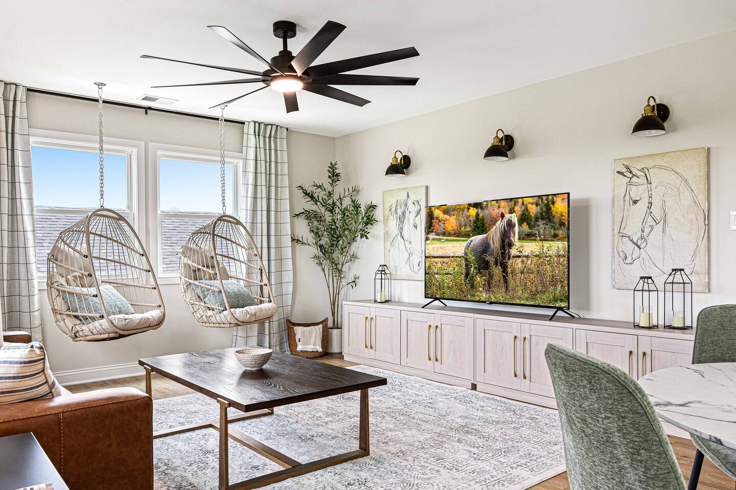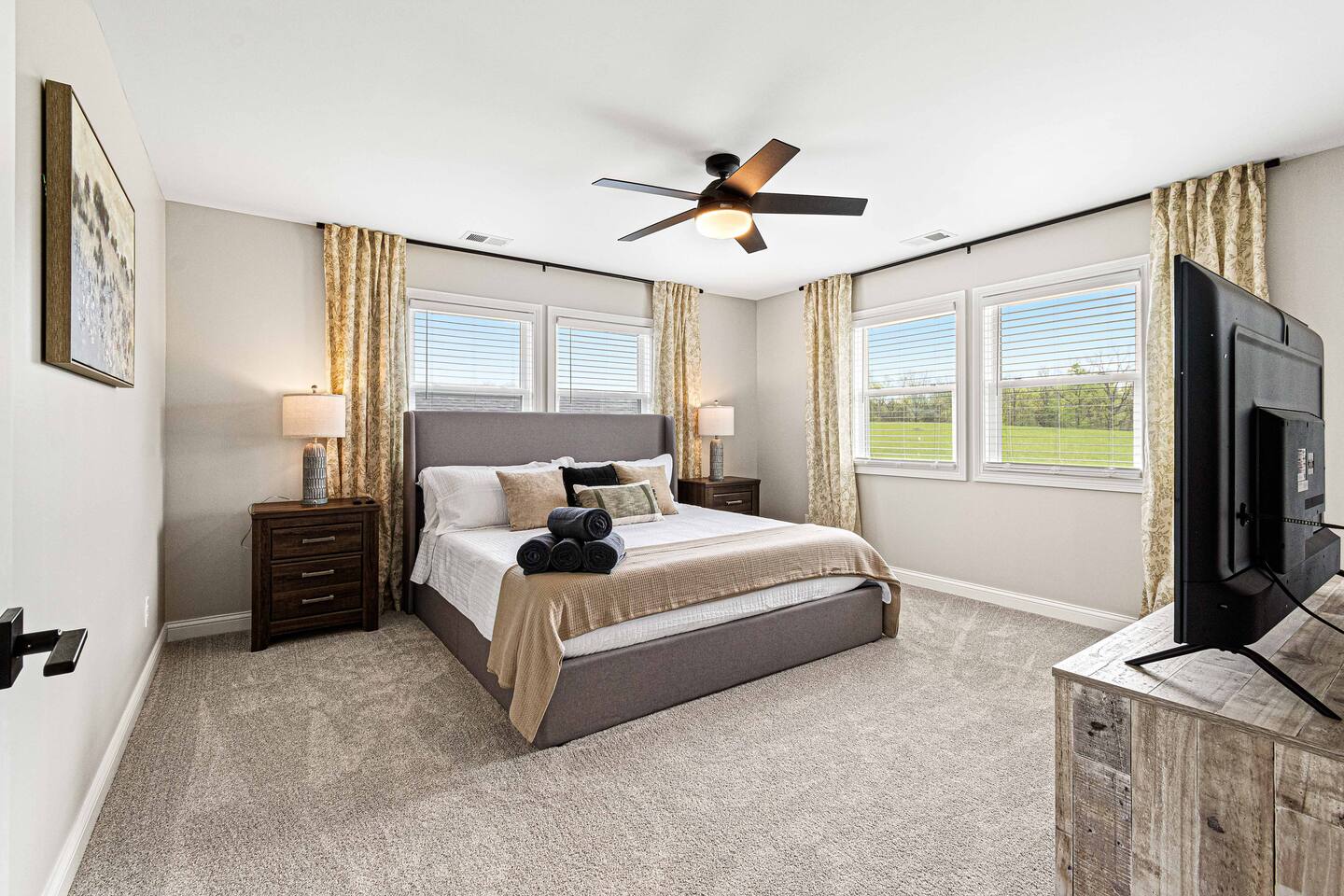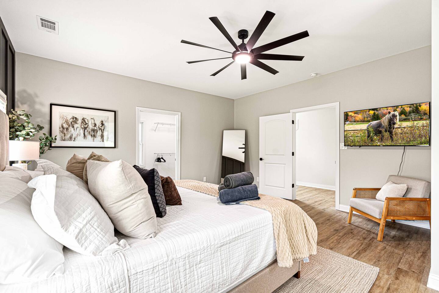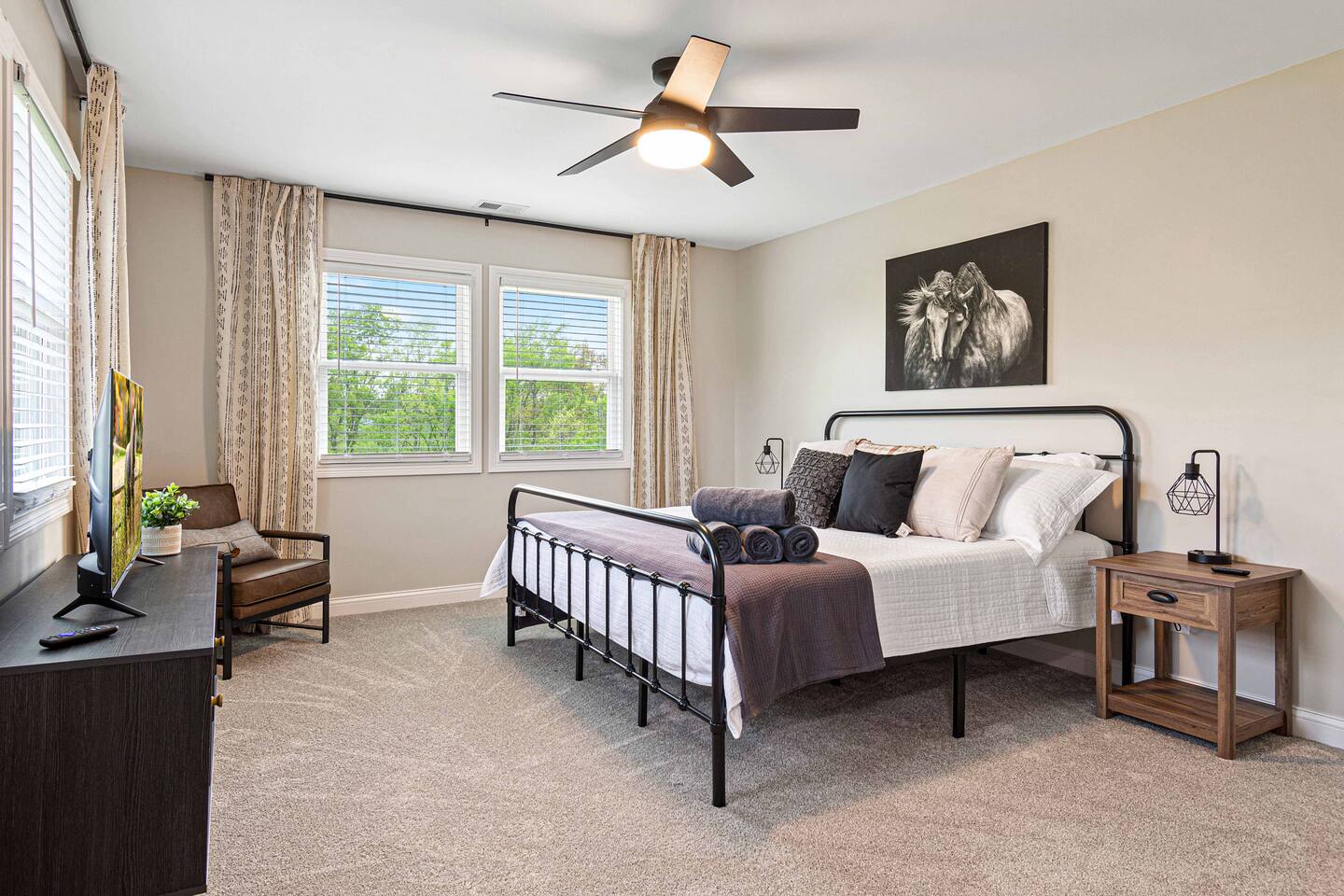 ★★★★★ "We thoroughly enjoyed the hot tub and spent evenings by the fire pit and in the well equipped game room!" ❊Massive Game Room ❊5 acres of seclusion ❊Large Bar, mini fridge, ice maker and all of the barware needed to mix up your favorite beverages! ❊Pool table, shuffleboard, foosball, poker table ❊Massive 85-inch smart TV surrounded by large sectional ❊2 65-inch Roku TVs in both main living room and upstairs loft ❊Covered 6-person Hot Tub ❊2 covered patios with seating areas ❊Large backyard fire pit overlooking the rolling hills ❊Horseshoe pit, corn hole and bocce ball. ❊Propane grill w/ utensils ❊Fully loaded kitchen with brand new stainless-steel appliances ❊Keurig, French Press, & tea kettle ❊Large 8-person dining table alongside 4-person island seating area ❊Full size washer/dryer This 4 Bedroom/2.5 bath can accommodate up to 12 people comfortably. Nestled amidst the picturesque landscape of semi-rural KY, our house is a tranquil haven away from the hustle and bustle of city life. Enjoy privacy and seclusion on 5 acres of rolling hills while being just minutes from some of Kentucky’s most famous distilleries along the Bourbon Trail, including Buffalo Trace, Bulleit and Jeptha Creed! Explore the charm of nearby towns with just a short drive to Frankfort, Shelbyville, and easy access to both Louisville and Lexington! This property is equipped with endless activities and amenities for you to enjoy with friends & family. Soak in the brand-new 6-person hot tub, or roast marshmallows in the massive backyard firepit beneath the string lights in full seclusion. Challenge your friends to endless games ranging from billiards, shuffleboard, foosball, poker, horseshoes, and corn hole. After a long day, kick back and enjoy a movie on the 85-inch flat screen TV within the massive game room. ✦Kitchen✦ Love coffee? We have you covered with a Keurig Duo, French Press, tea kettle, k-cups, ground coffee, creamers, and tea! Embrace your inner chef and prepare delicious meals in the fully loaded kitchen, featuring black leathered granite countertops, brand-new stainless-steel appliances and all essential cookware. ✦Sleeping Accommodations✦ ✦Primary Suite: This main level bedroom contains a King bed with a luxury memory foam mattress and high-quality linens to ensure a great night's sleep! Enjoy the massive walk-in closet, and a 50” Roku smart TV. The en-suite bath comes complete with a double vanity, and walk-in shower. For your convenience, we've taken care of your toiletry needs. Shampoo, conditioner, toilet paper, makeup towels and a hairdryer are provided. ✦Upstairs Bedrooms 2 & 3 each offer a comfortable, plush king-sized bed, luxury linens, a smart Roku TV, and a walk-in closet for convenience. ✦Bedroom 4: This spacious bedroom features two Queen beds each with a comfortable memory foam mattress and luxury linens! ✦Upstairs loft with Queen Size sleeper sofa: Unwind in a Kentucky Farmhouse themed loft, featuring hanging chairs, stylish wallpaper, 65-inch Roku TV and card table for entertainment. Extra Sleeping Space: The queen sleeper sofa provides additional sleeping accommodations for guests. ✦Upstairs Bathroom: The upstairs hallway bathroom features a large double vanity, shower/tub combo, shampoo, conditioner, makeup towels and a hairdryer are provided for your use. Escape to our Modern Farmhouse Retreat and experience the best of Kentucky's bourbon country in style and comfort. Book your stay now and make unforgettable memories in this enchanting destination! ✦Nearby Distilleries✦ ∗Bulleit Distilling Co ∗Three Boys Farm Distillery *Whiskey Thief Distilling Co *The Barrel Room *The Last Stope Brewing ∗Buffalo Trace Distillery: One of the most famous distilleries in Kentucky! *Glenn's Creek ∗Jeptha Creed Distillery: tours and tastings of their craft spirits, including vodka, moonshine, and bourbon. ∗Castle & Key Distillery: Castle & Key Distillery is housed in a historic property with beautifully restored gardens. Visitors can take guided tours of the distillery and enjoy tastings of their premium spirits. *Wild Turkey *Four Roses *Lawrenceburg Bourbon Co ✦Wineries✦ ∗Talon Winery & Vineyards: Offers wine tastings and tours of their picturesque vineyard. Visitors can sample a variety of wines and relax in the scenic outdoor setting. ∗Lovers Leap Winery ∗Prodigy Vineyards & Winery ∗Equus Run Vineyards *Rising Sons Winery ✦Other local attractions✦ ∗Keeneland ∗Churchill Downs (Derby) *The Kentucky Castle *The Kentucky River Boat Tours *Claudia Sanders Dinner House *Guist Creek and Marina *Shelby County Park and Recreation ✦Grocery✦ ∗Both Walmart Supercenter and Kroger are just a short drive away to pick up everything you'll need during your stay!
