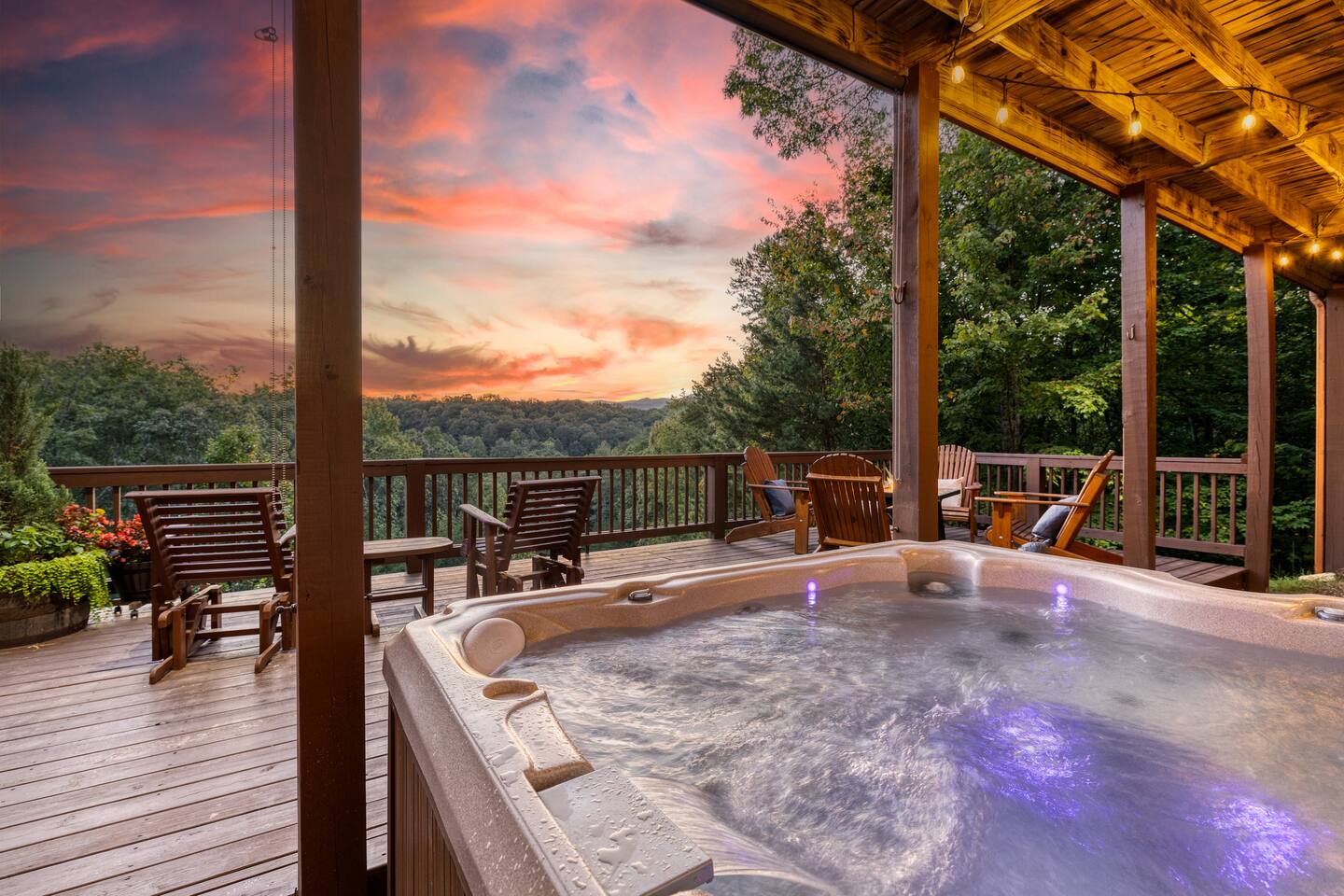✨ About Sunset Summit Perched atop an easy-to-access paved mountain road and perfectly situated between Blue Ridge and Ellijay (10–15 minutes each way), Sunset Summit offers the ideal blend of scenery, comfort, privacy, and convenience. This spacious three-story cabin in Cherry Log invites you to unwind, reconnect, and savor sweeping sunset views from nearly every level. Designed for effortless relaxation, the home features a wraparound covered porch, a sunny open-air deck, multiple gathering spaces, and thoughtful touches throughout—making it perfect for family trips, friend getaways, or a peaceful personal retreat. 🏔️ Breathtaking Outdoor Living Whether you're here for sunrise coffee or evening stargazing, the outdoor spaces are unforgettable: •Three decks with panoramic sunset views •Outdoor wood-burning fireplace with starter logs •Propane fire pit for cozy conversation •Jacuzzi hot tub overlooking the mountains •Rocking chairs and multiple seating areas •Propane grill for easy outdoor meals •Level 2 EV charger for convenient charging The perfect setting for unforgettable mornings and magical mountain evenings. 🔥 Warm & Inviting Indoor Spaces Step inside to cathedral ceilings, warm wood finishes, and gathering spaces designed for comfort: •Indoor gas fireplace set beneath towering stonework •Three living levels with plenty of room to spread out •Fast Wi-Fi, complimentary YouTube TV, and Smart TVs •Large windows filling the home with natural light No matter the season, the cabin offers a welcoming atmosphere for relaxation. 🎮 Entertainment for Everyone On the terrace level, you’ll find the ultimate game and media hub: •8-foot pool table •Darts & poker setup •Nintendo Wii U for nostalgic gaming fun •Two 65" TVs for game days & movie nights •Cozy lounge seating with direct access to the hot tub deck Perfect for rainy days, family tournaments, or late-night laughs with friends. 👨🍳 Fully Equipped Kitchen & Dining The well-stocked kitchen has everything you need to cook, entertain, or simply enjoy a relaxed brunch: •Pots, pans, dishes, glasses, utensils & spices •Stainless steel appliances •Indoor dining table for eight •Outdoor dining table for eight •Ideal flow from kitchen → dining → deck for effortless hosting •Cook big family meals or simply sip morning coffee with mountain air drifting in. 🛏️ Comfortable Bedrooms for Restful Nights Each of the three bedrooms features its own private bathroom, high-quality linens, and plenty of privacy: •Main-Level King Suite •Upper-Level King Suite •Lower-Level Queen Suite After long days of exploring, enjoy a soak in the hot tub or unwind with your favorite show before settling into plush bedding for a peaceful night’s sleep. 📍 Unbeatable Location Sunset Summit is a rare blend of peaceful seclusion and easy access. Just a short paved drive from the main highway and close to: •Downtown Blue Ridge (10–15 min) •Ellijay (10–15 min) •Hiking, waterfalls & wineries •Scenic railway, orchards, shopping & dining Whether you want adventure, relaxation, or a bit of both, it’s all within reach. 🛠️ Thoughtful Extras •Unlimited high-speed Wi-Fi •YouTube TV included •Washer & dryer •Level 2 EV charger •Starter logs provided •Plenty of parking As a privately owned and personally managed cabin, Sunset Summit is cared for with attention to detail. We’re committed to providing warm hospitality, quick communication, and the kind of personal service large rental companies simply can’t match.