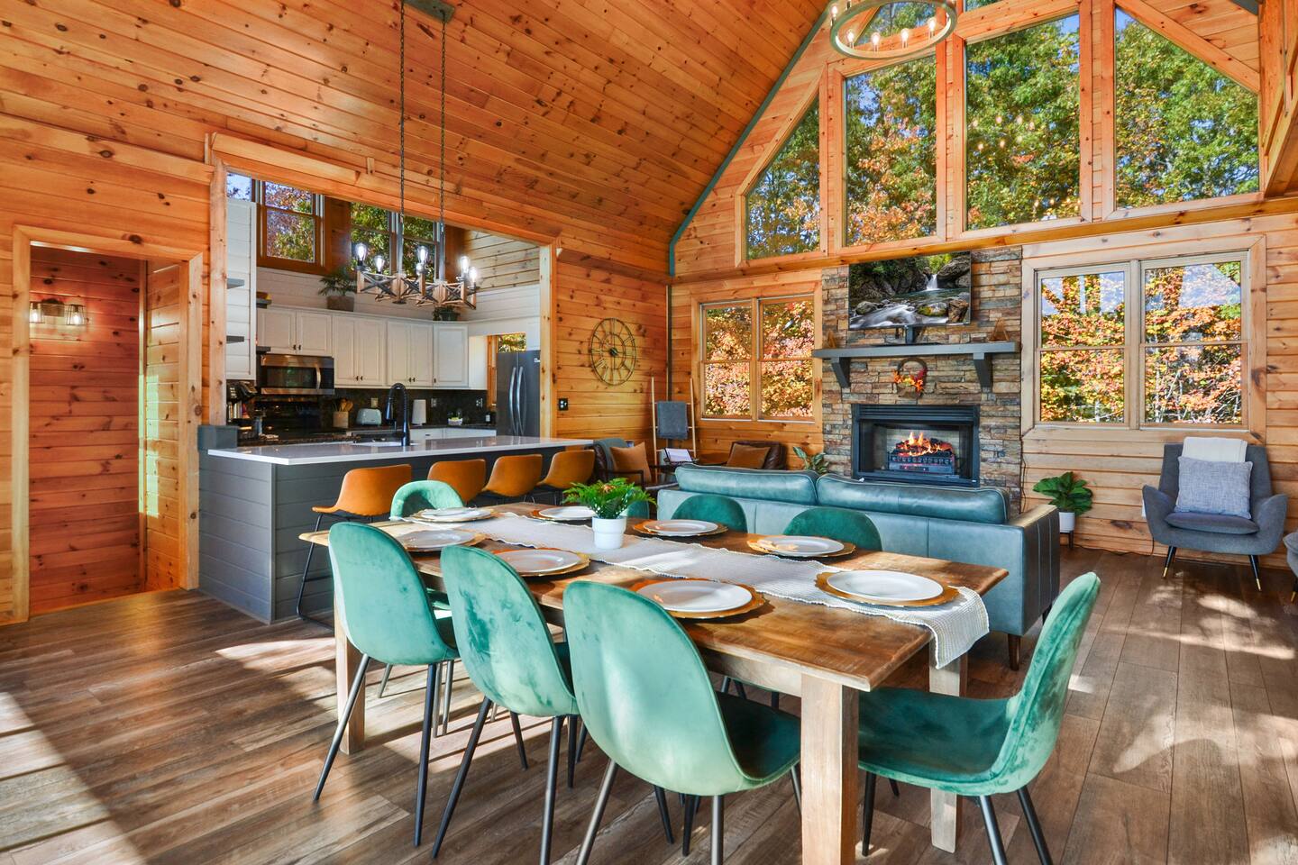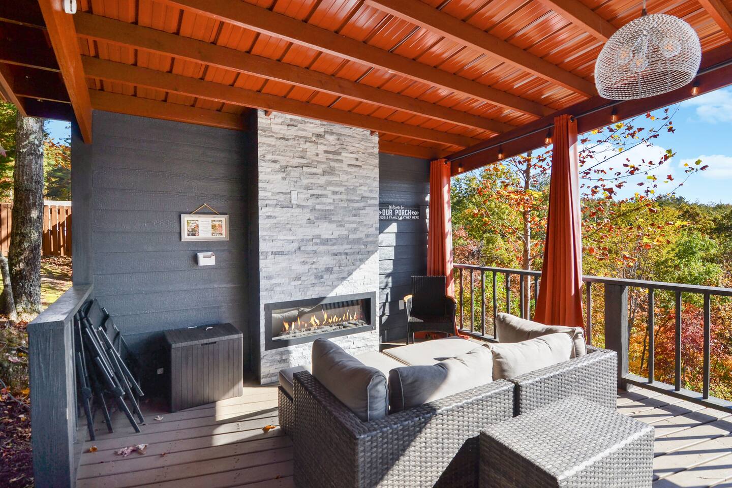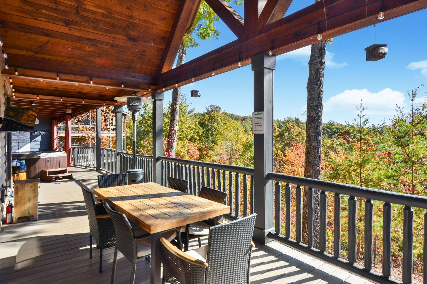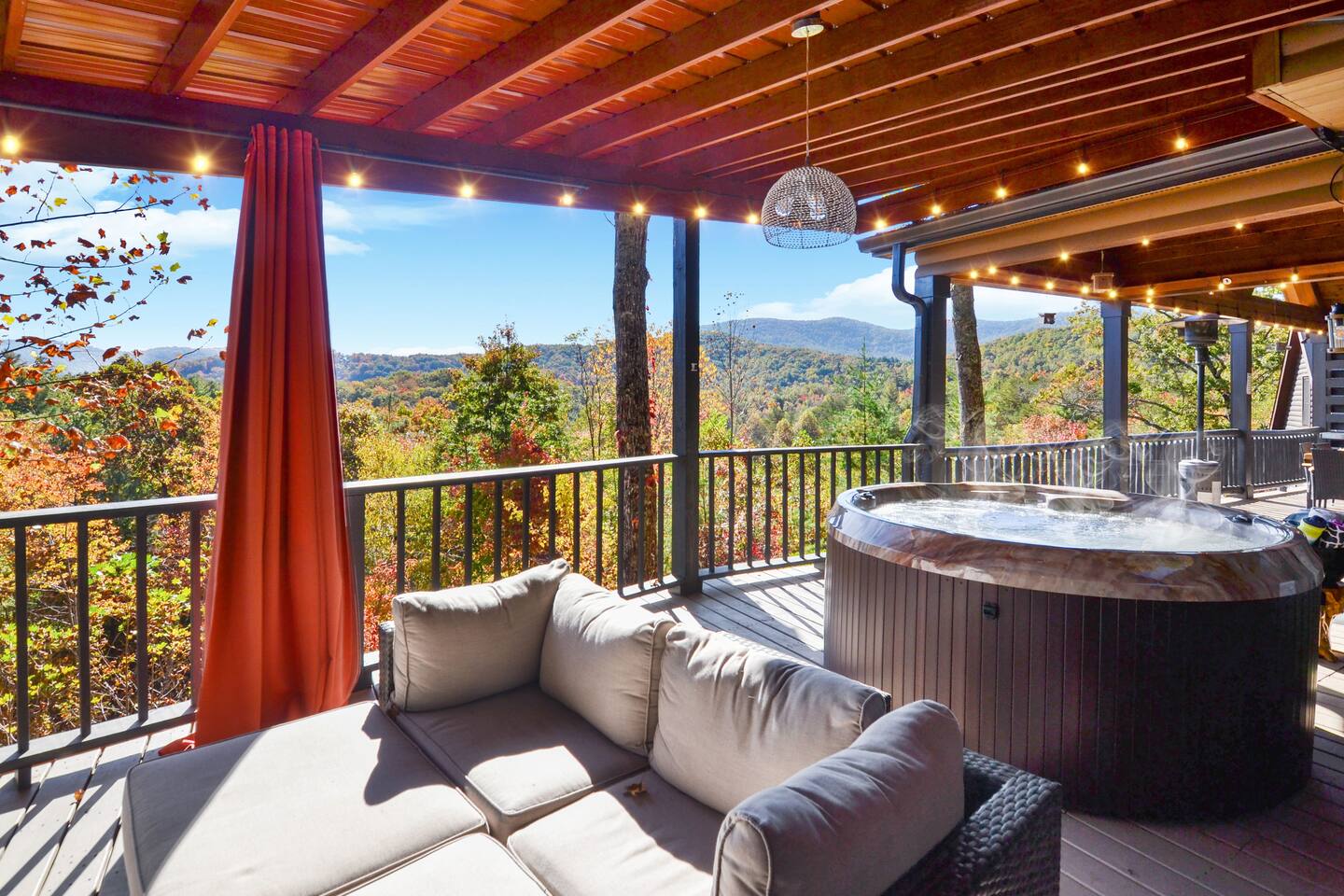 ★★★★★ "...Plenty of space, nice bedrooms, great kitchen, fun game room, and an amazing large deck with unforgettable views." •STUNNING VIEWS of the Cohutta Mountains •Luxurious Cabin •Massive Deck with electric fireplace & seating areas •Brand new Hot-Tub! •Weber grill •Fast 1GB Wi-Fi w/ YouTube streaming provided •Game room w/ shuffleboard, foosball & board games •Fully stocked kitchen •3 King beds. 1 sofa bed, 1 bunk bed twin over full