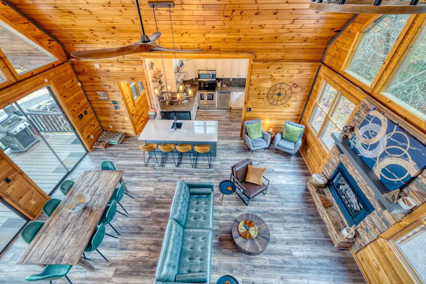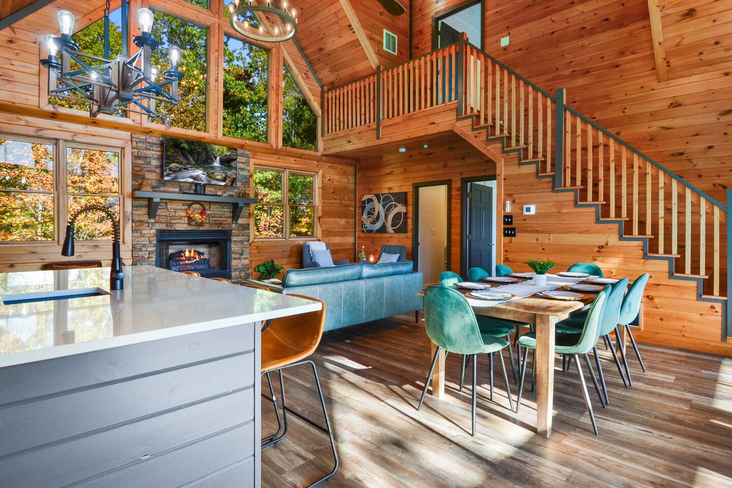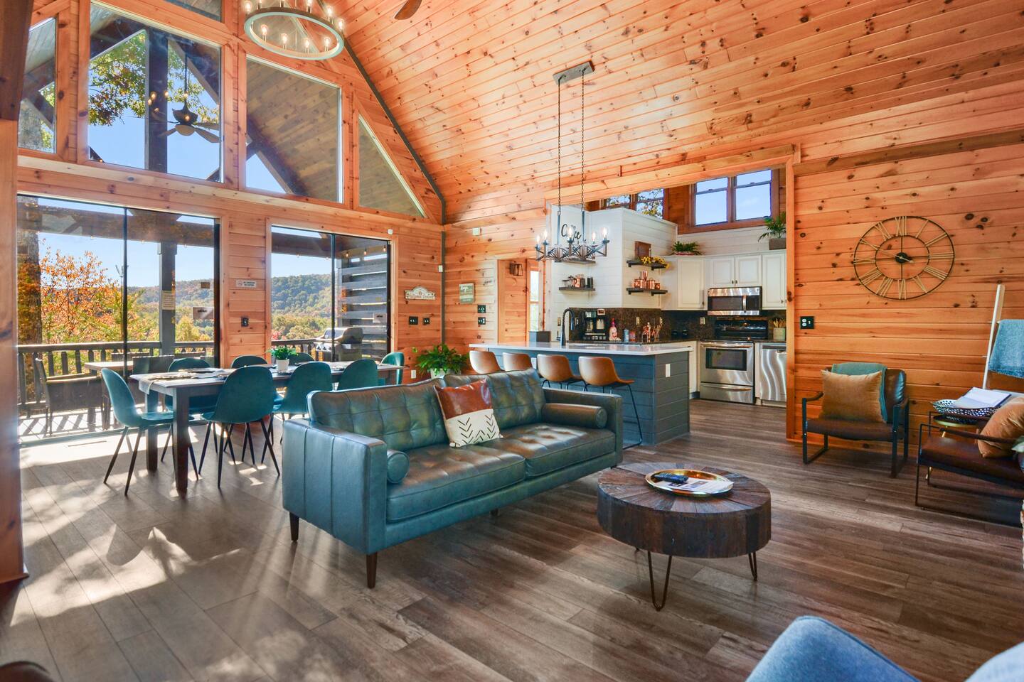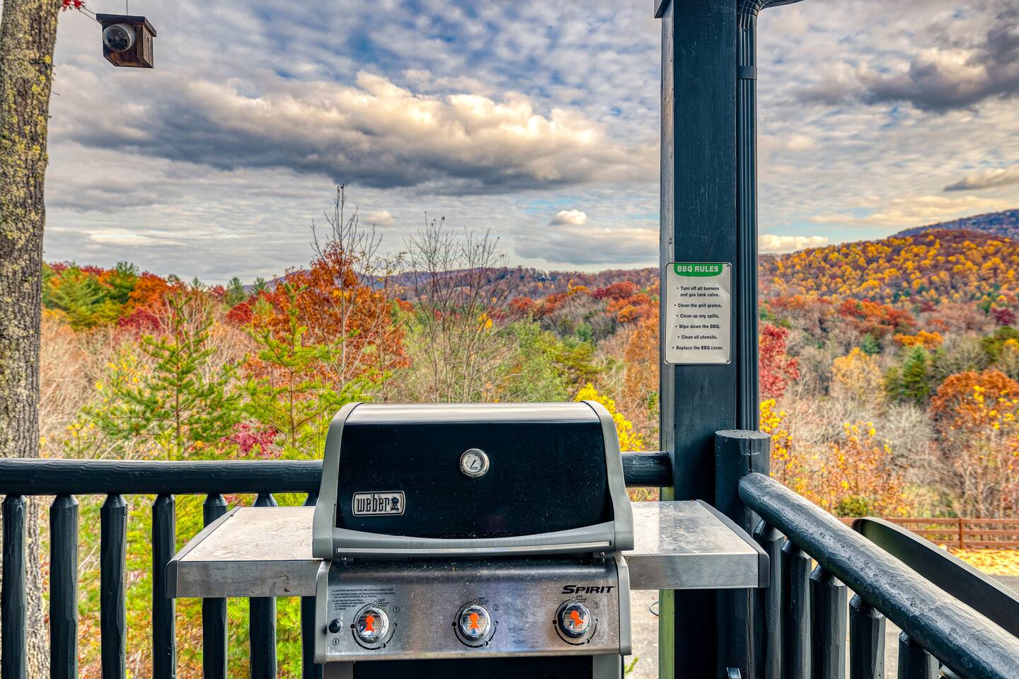 ★★★★★ "...Plenty of space, nice bedrooms, great kitchen, fun game room, and an amazing large deck with unforgettable views." •STUNNING VIEWS of the Cohutta Mountains •Luxurious Cabin •Massive Deck with electric fireplace & seating areas •Brand new Hot-Tub! •Weber grill •Fast 1GB Wi-Fi w/ YouTube streaming provided •Game room w/ shuffleboard, foosball & board games •Fully stocked kitchen •3 King beds. 1 sofa bed, 1 bunk bed twin over full