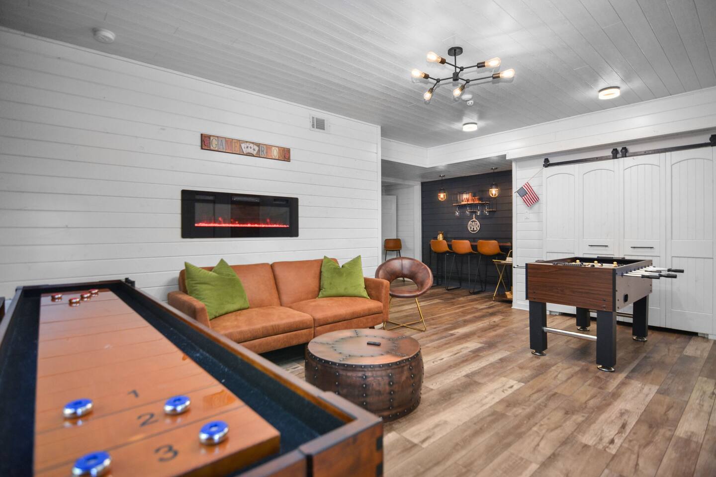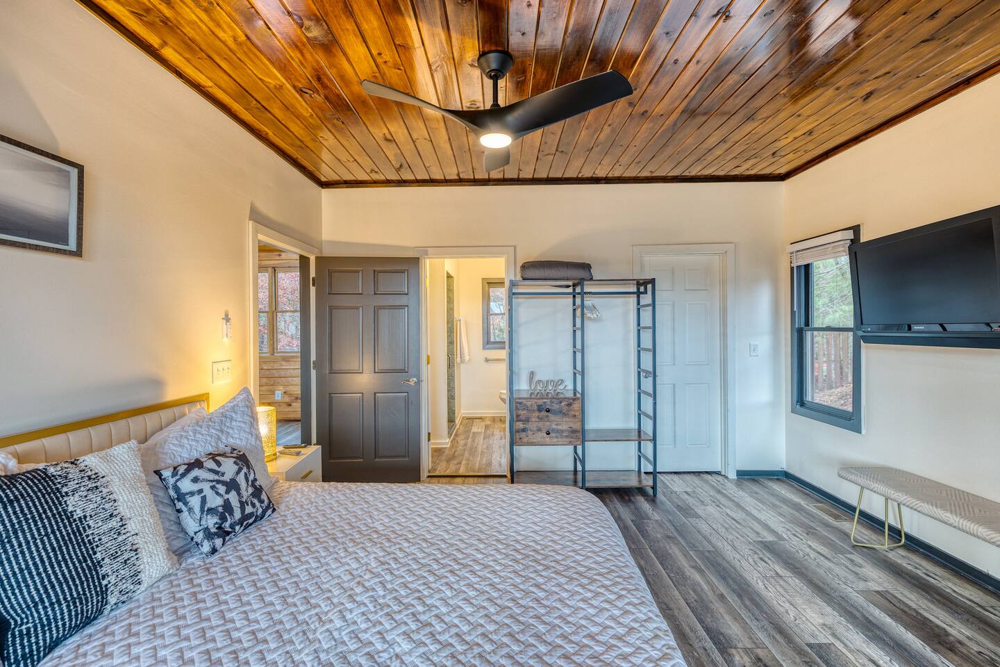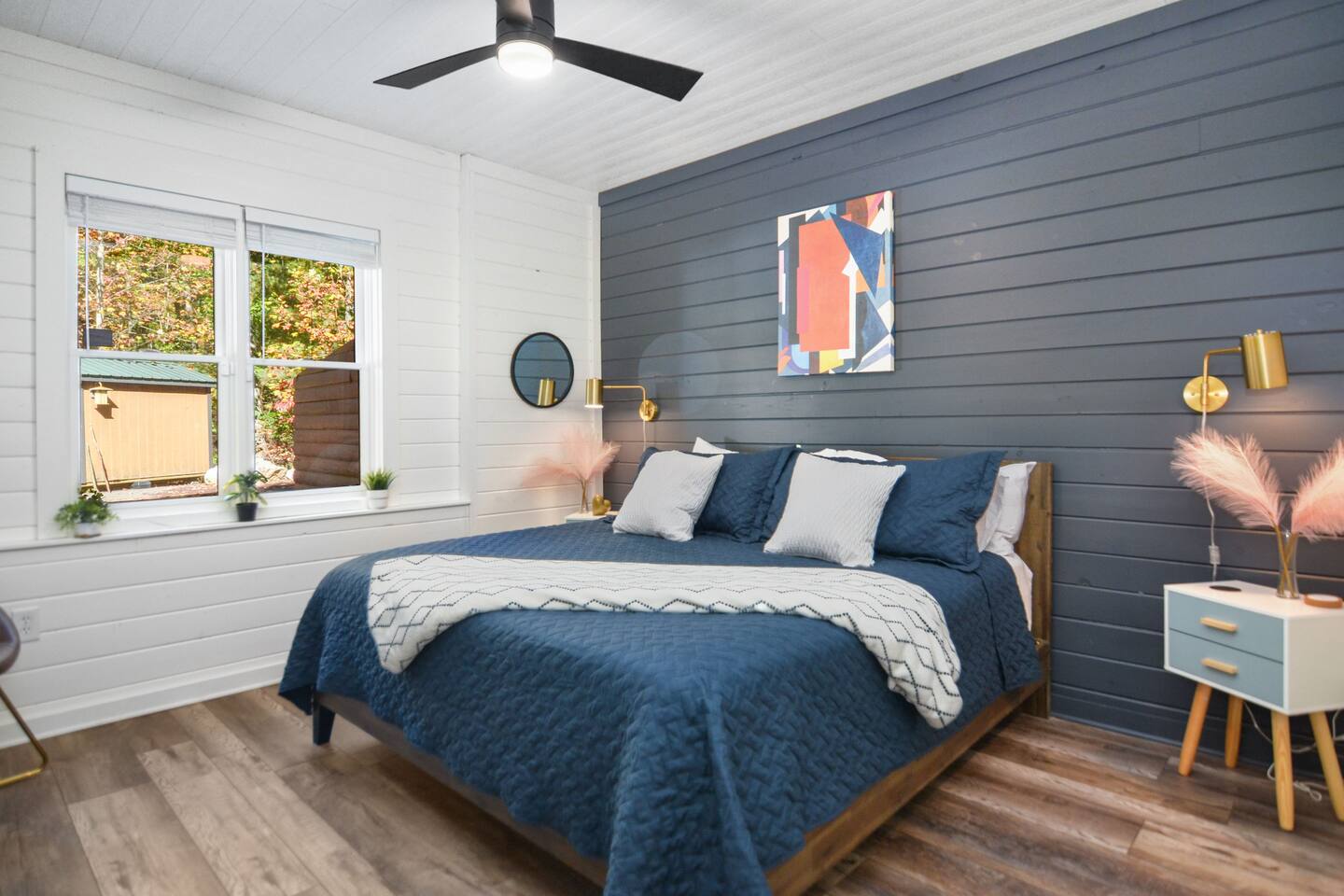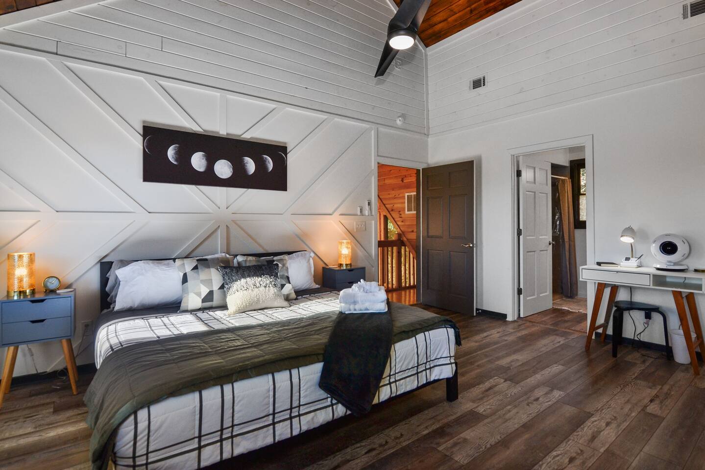 Nestled amidst the breathtaking beauty of the Cohutta Mountains, this luxurious retreat is loaded with amenities and all the comforts of home! ✦The Outdoor Space✦ Step onto the vast, expansive deck to soak in panoramic mountain views from the brand-new hot tub. Dine at the outdoor table with seating for 6 and grill up a feast on the Weber grill. Relax on the cozy outdoor sectional by the built-in electric fireplace. The deck leads to a fenced yard, ideal for pets and children, where you can also enjoy a smokeless wood-burning solo stove and a fun game of cornhole! ✦Living Room✦ • Features a Smart TV, one sofa, two armchairs, a reading nook, and a coffee table. • Boasts a wall of windows and an electric fireplace operated by remote control. • High vaulted ceilings create a spacious feel in this 2665 sq ft home. ✦Dining Room✦ • Offers a dining table with seating for 8. • Features a wall of windows with panoramic mountain views. • Provides access to the deck through 2 sets of sliding doors. ✦Kitchen✦ • Fully loaded kitchen to meet all your cooking needs. • Quartz countertops. • Includes a coffee nook with a dual coffee maker. • Features full-size appliances, a refrigerator, microwave, and 2 mini-fridges for extra storage. • Offers a dishwasher, electric range, and oven. • Provides counter seating for 4. ✦Sleeping Arrangements✦ Bedroom 1 (main level) • Enjoy a plush King bed, nightstands with lamps and charging ports, smart TV, and a free-standing closet with hangers. Bathroom 1: • Features a full bathroom with a glass-enclosed rainwater shower and a modern vanity. Bedroom 2 - Upstairs (Master w/ en-suite bathroom): • luxurious King bed. • Smart TV. • Convenient side tables with lamps and charging ports. • A well-appointed study table for work or leisure. • Enjoy relaxation in the armchair with a side table. • Find ample storage in the walk-in closet, complete with hangers. • En-suite full bathroom with a rainwater shower head. Bedroom 3 (main level) • Relax in the elegance of a plush King bed. • Enjoy entertainment on the Smart TV. • Wall sconces and charging ports for your convenience. • An inviting console table with an electric fireplace. • Storage space available in the closet with hangers. Private room- (basement level) •Bunk bed- Twin over Full, wall mounted smart TV, side table, lamp and additional charging ports BATHROOM 3: • Blue tile shower with rainwater shower head. ✦Game Room✦ • Gather around the recessed fireplace • Accommodate additional guests with a sofa bed. • Comfortable armchairs and side tables provide ample seating. • Challenge your friends to a game of shuffleboard or foosball. • An assortment of board games for indoor entertainment. • Bar area with a bar cart, bar accessories, and a Keurig coffee maker. • washer and dryer located in closet.