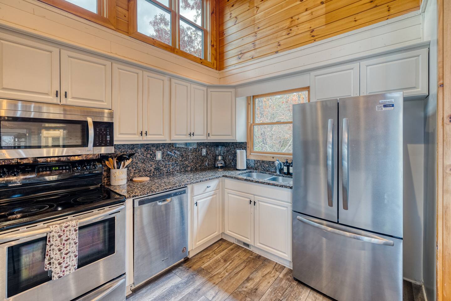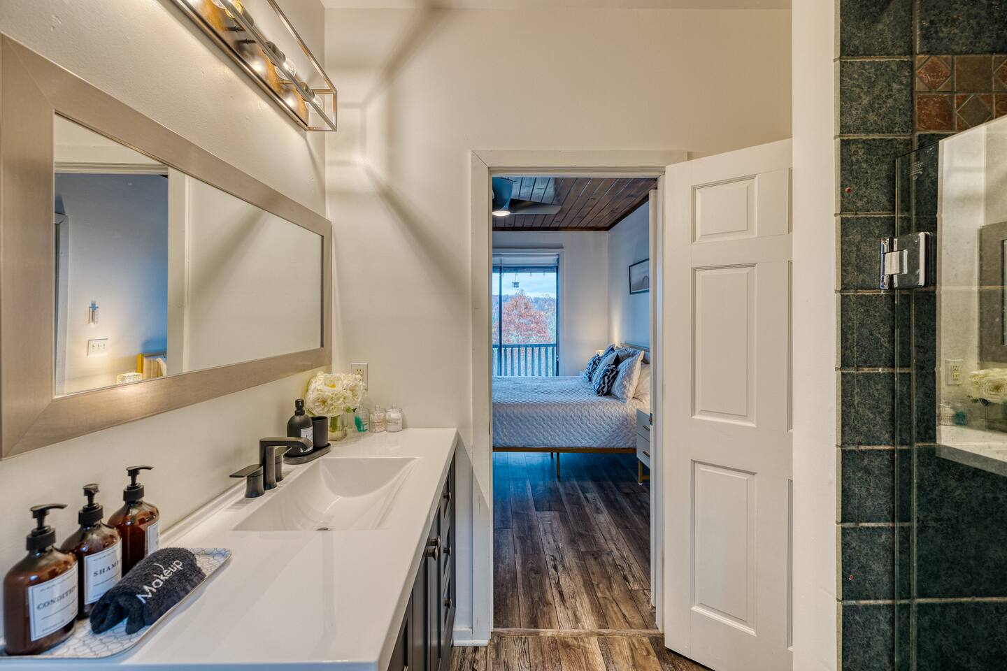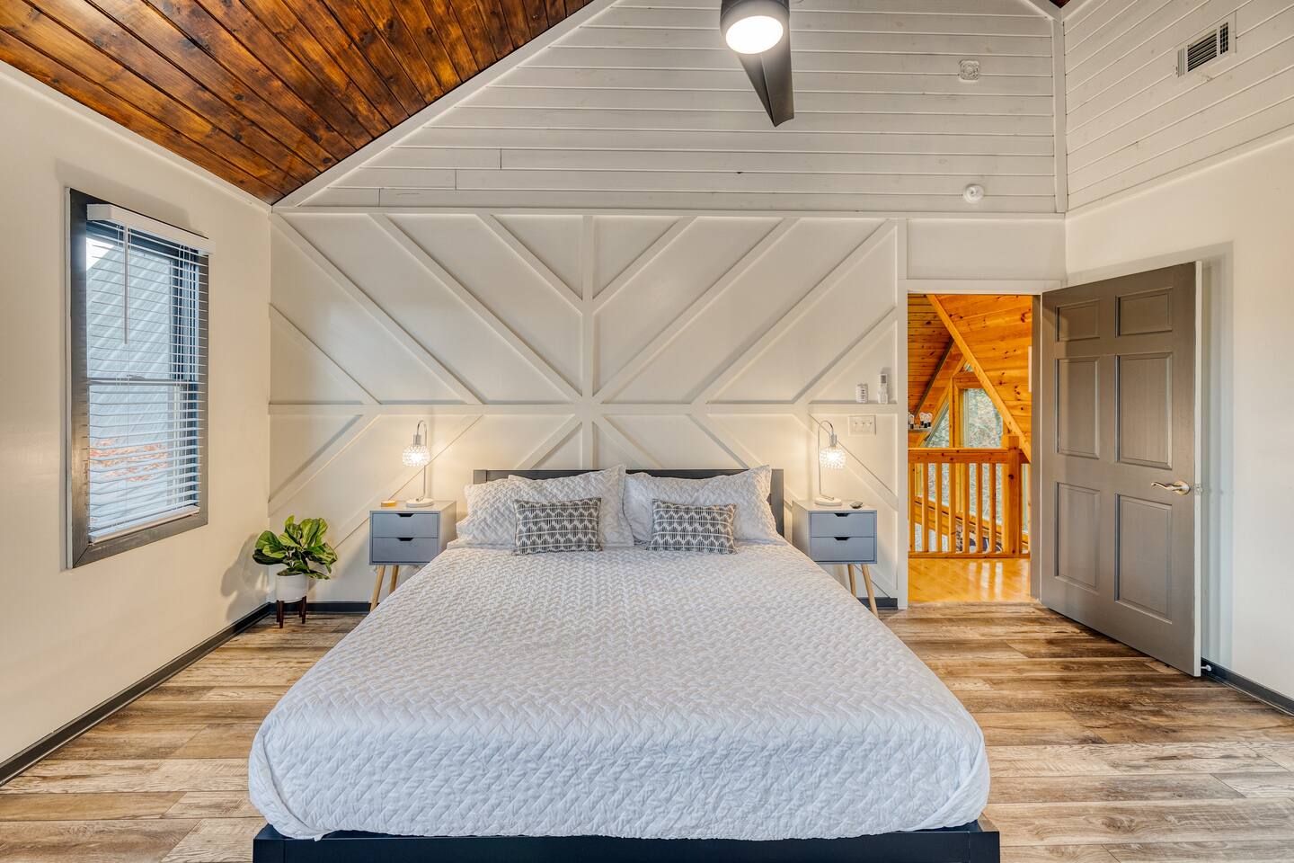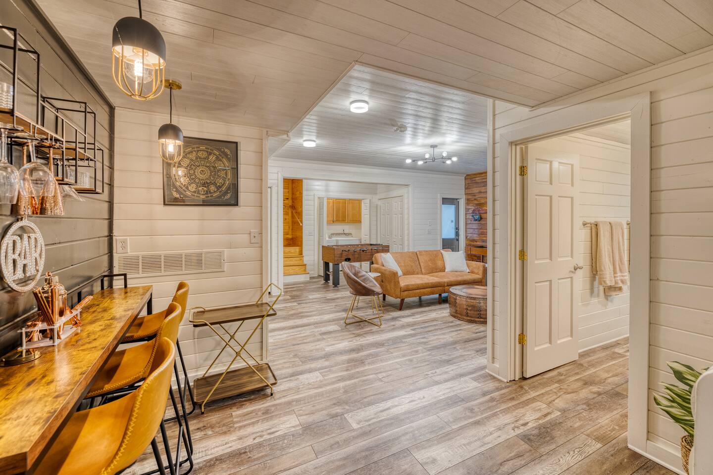 Nestled amidst the breathtaking beauty of the Cohutta Mountains, this luxurious retreat is loaded with amenities and all the comforts of home! ✦The Outdoor Space✦ Step onto the vast, expansive deck to soak in panoramic mountain views from the brand-new hot tub. Dine at the outdoor table with seating for 6 and grill up a feast on the Weber grill. Relax on the cozy outdoor sectional by the built-in electric fireplace. The deck leads to a fenced yard, ideal for pets and children, where you can also enjoy a smokeless wood-burning solo stove and a fun game of cornhole! ✦Living Room✦ • Features a Smart TV, one sofa, two armchairs, a reading nook, and a coffee table. • Boasts a wall of windows and an electric fireplace operated by remote control. • High vaulted ceilings create a spacious feel in this 2665 sq ft home. ✦Dining Room✦ • Offers a dining table with seating for 8. • Features a wall of windows with panoramic mountain views. • Provides access to the deck through 2 sets of sliding doors. ✦Kitchen✦ • Fully loaded kitchen to meet all your cooking needs. • Quartz countertops. • Includes a coffee nook with a dual coffee maker. • Features full-size appliances, a refrigerator, microwave, and 2 mini-fridges for extra storage. • Offers a dishwasher, electric range, and oven. • Provides counter seating for 4. ✦Sleeping Arrangements✦ Bedroom 1 (main level) • Enjoy a plush King bed, nightstands with lamps and charging ports, smart TV, and a free-standing closet with hangers. Bathroom 1: • Features a full bathroom with a glass-enclosed rainwater shower and a modern vanity. Bedroom 2 - Upstairs (Master w/ en-suite bathroom): • luxurious King bed. • Smart TV. • Convenient side tables with lamps and charging ports. • A well-appointed study table for work or leisure. • Enjoy relaxation in the armchair with a side table. • Find ample storage in the walk-in closet, complete with hangers. • En-suite full bathroom with a rainwater shower head. Bedroom 3 (main level) • Relax in the elegance of a plush King bed. • Enjoy entertainment on the Smart TV. • Wall sconces and charging ports for your convenience. • An inviting console table with an electric fireplace. • Storage space available in the closet with hangers. Private room- (basement level) •Bunk bed- Twin over Full, wall mounted smart TV, side table, lamp and additional charging ports BATHROOM 3: • Blue tile shower with rainwater shower head. ✦Game Room✦ • Gather around the recessed fireplace • Accommodate additional guests with a sofa bed. • Comfortable armchairs and side tables provide ample seating. • Challenge your friends to a game of shuffleboard or foosball. • An assortment of board games for indoor entertainment. • Bar area with a bar cart, bar accessories, and a Keurig coffee maker. • washer and dryer located in closet.